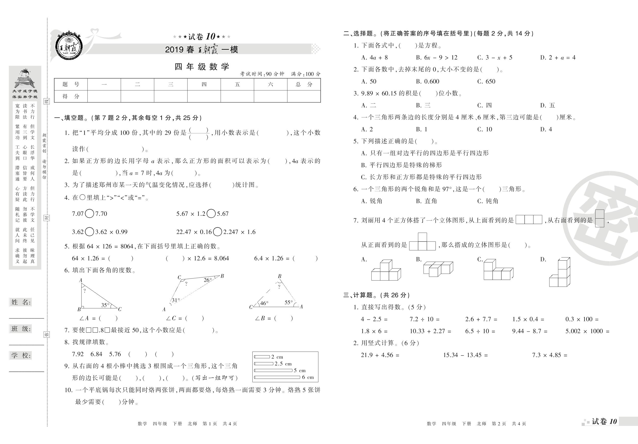 王朝霞期末模拟卷四年级下册数学(北师版)_R210804150800【10】