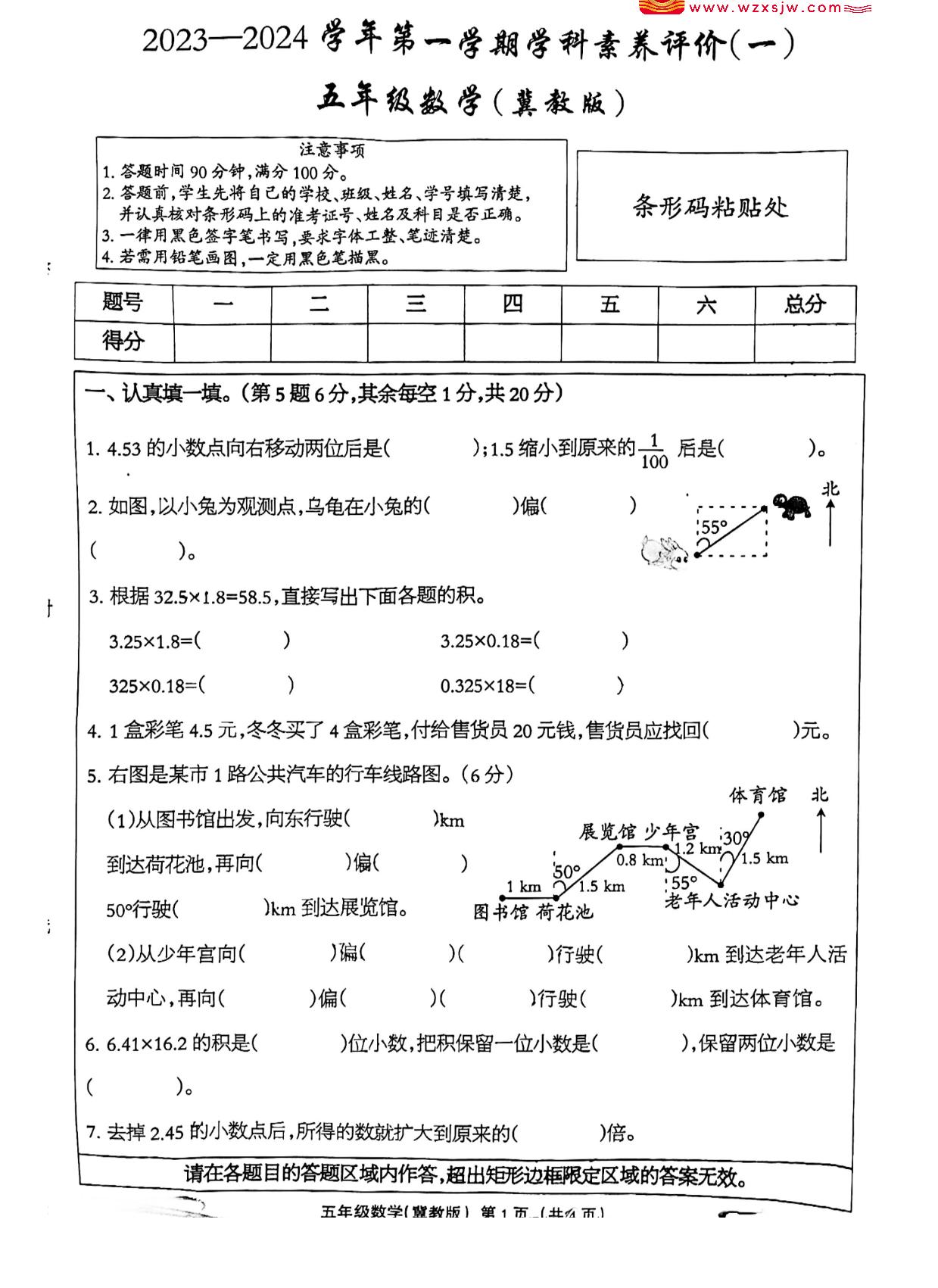 河北省邢台市南和县第二实验小学2023-2024学年第一学期学科素养评价一(月考)五年级数学(冀教版)