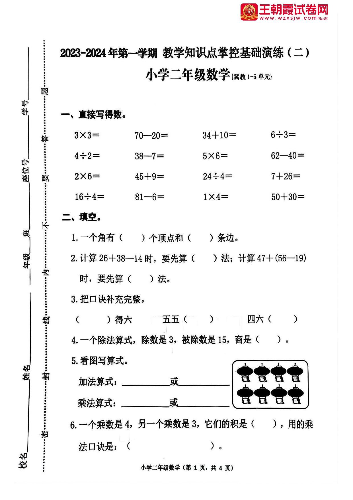 河北省唐山市玉田县2023-2024学年第一学期教学知识点掌控基础演练二(期中)二年级数学(冀教版)