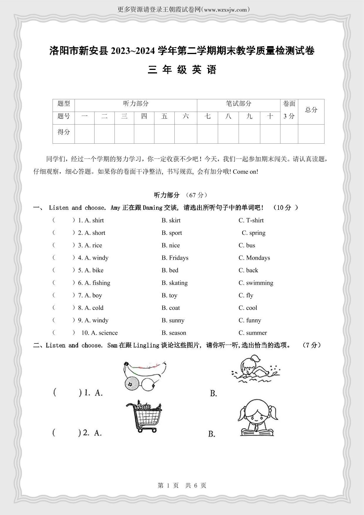 河南省洛阳市新安县2023~2024学年第二学期期末教学质量检测试卷三年级英语(外研版)【无听力音频】