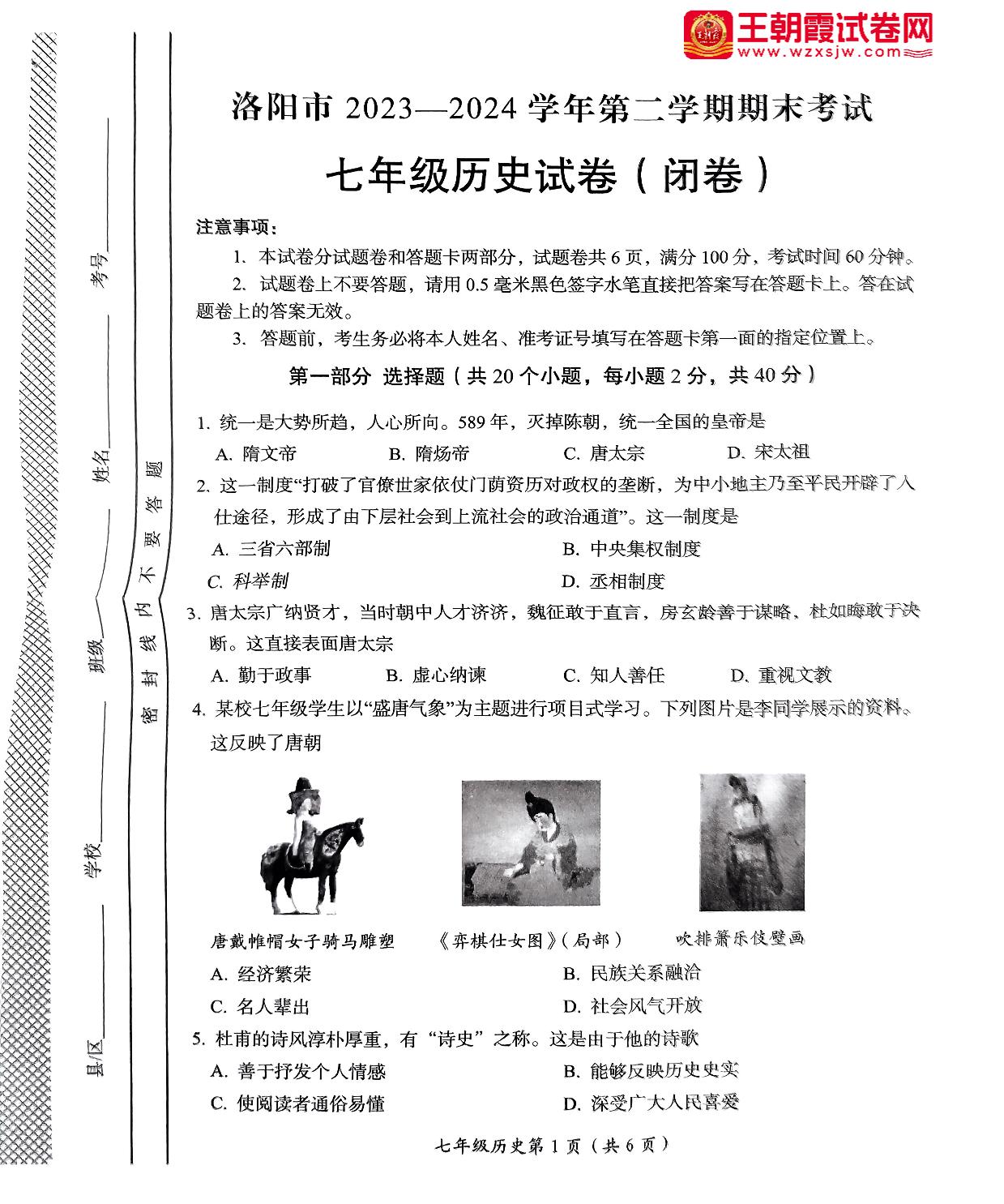 河南省洛阳市2023—2024 学年第二学期期末考试七年级历史试卷(闭卷)(人教版)