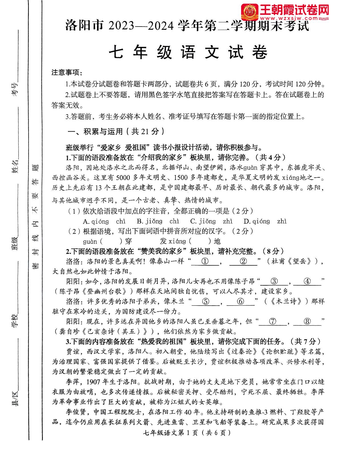 河南省洛阳市2023—2024 学年第二学期期末考试七年级语文试卷(人教版)