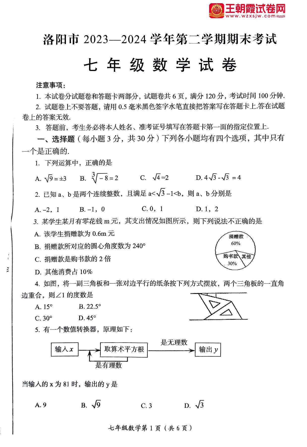 河南省洛阳市2023—2024 学年第二学期期末考试七年级数学试卷(人教版)