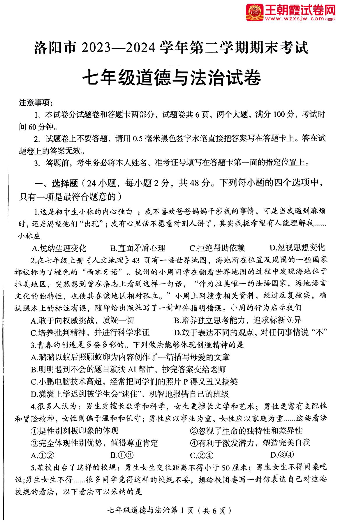 河南省洛阳市2023—2024 学年第二学期期末考试试卷七年级道德与法治(人教版)