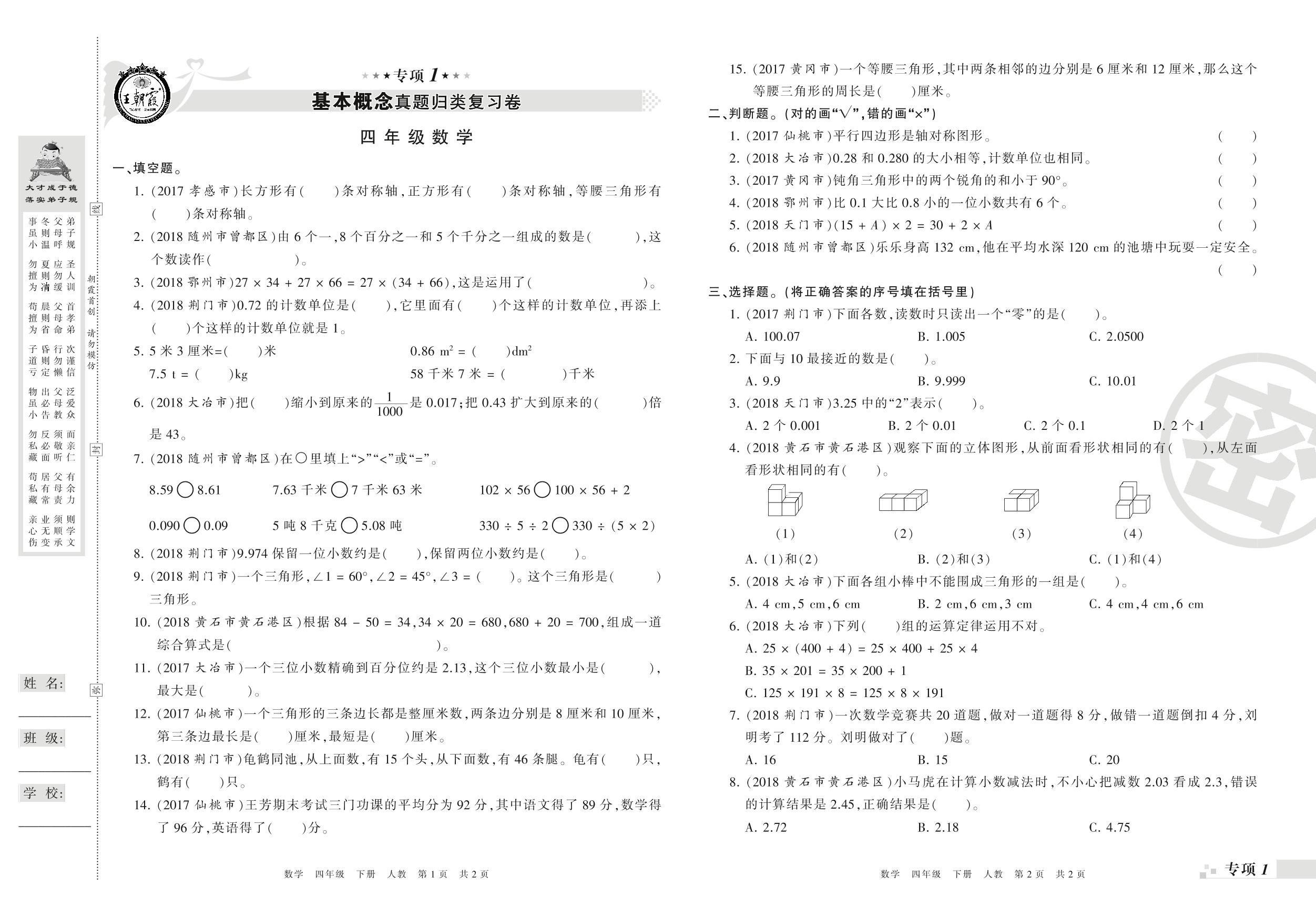 王朝霞期末专项卷——基本概念、计算真题归类复习卷四年级下册数学(人教版)_R210804150819【0】