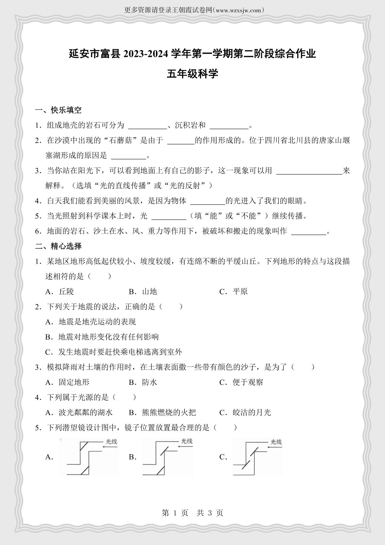 陕西省延安市富县2023-2024学年学年第一学期第二阶段综合作业(期中)五年级科学(教科版)