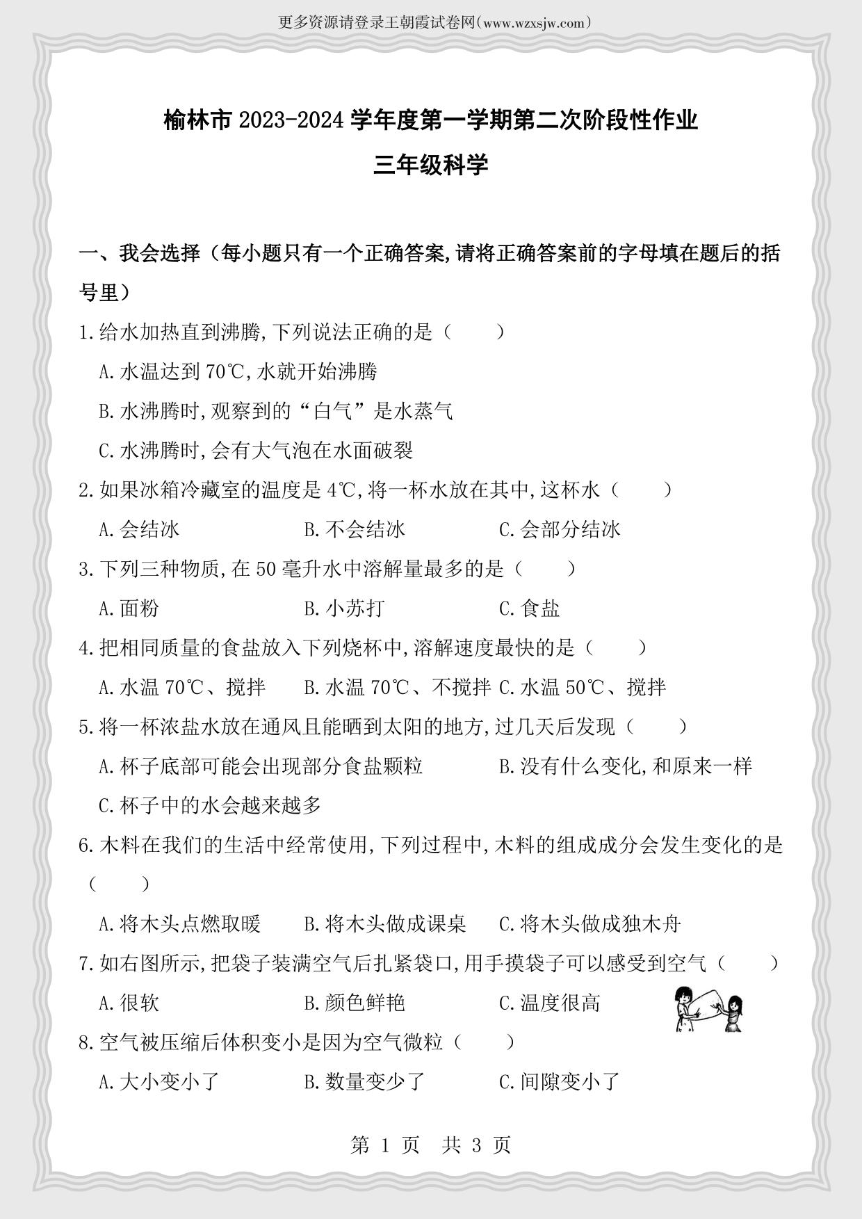 陕西省榆林市2023-2024学年学年第一学期第二阶段综合作业(期中)三年级科学(教科版)