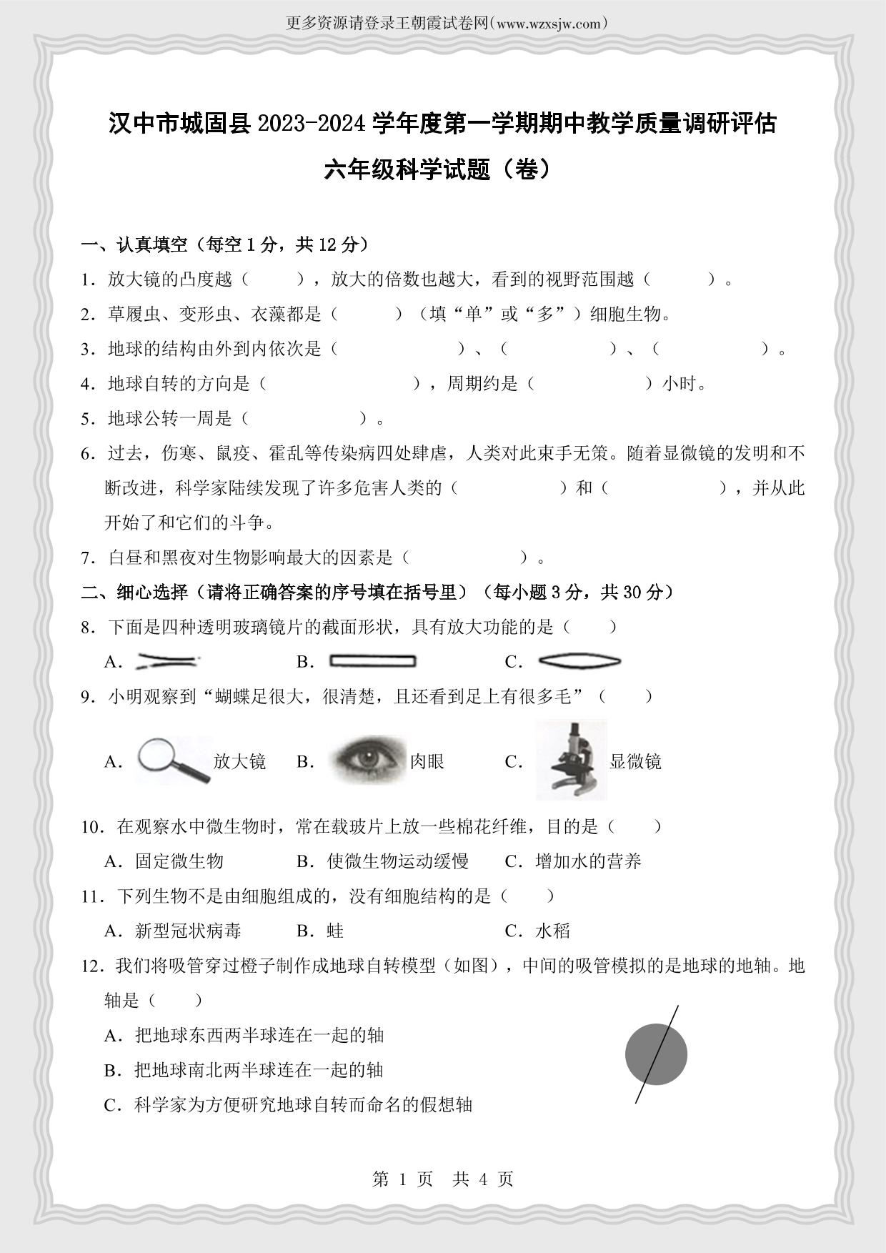 陕西省汉中市城固县2023-2024学年度第一学期期中教学质量调研评估六年级科学(教科版)