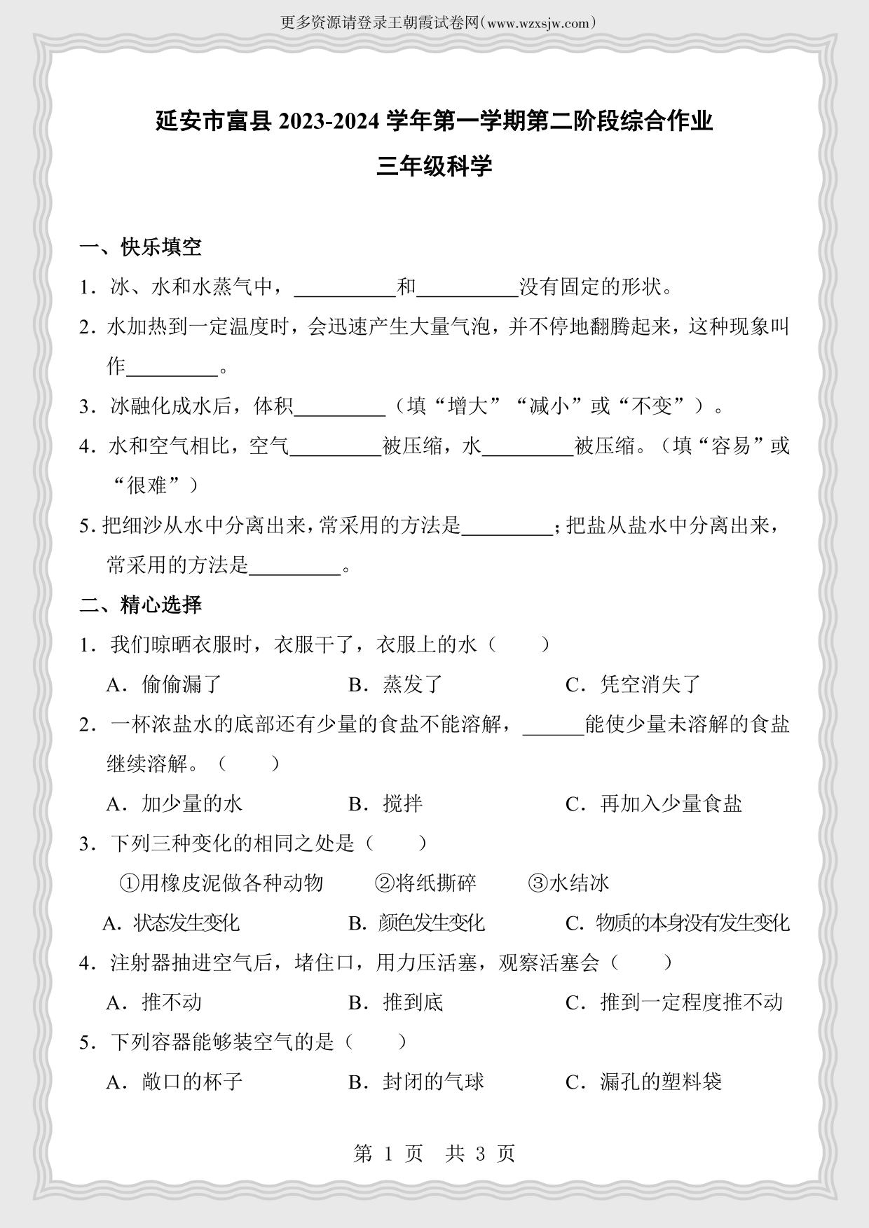 陕西省延安市富县2023-2024学年学年第一学期第二阶段综合作业(期中)三年级科学(教科版)