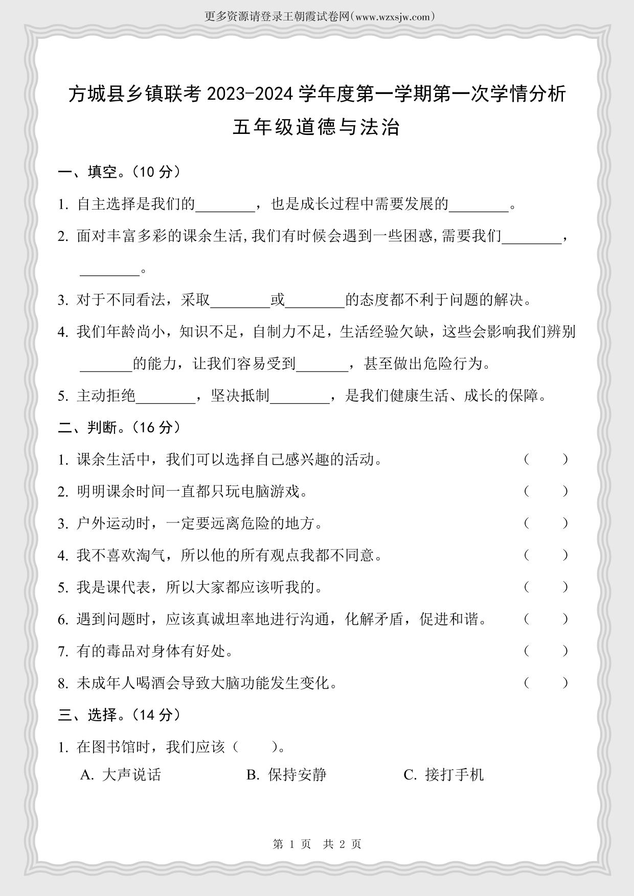 河南省南阳市方城县乡镇联考2023-2024学年度第一学期第一次学情分析10月月考五年级道德与法治(人教版)