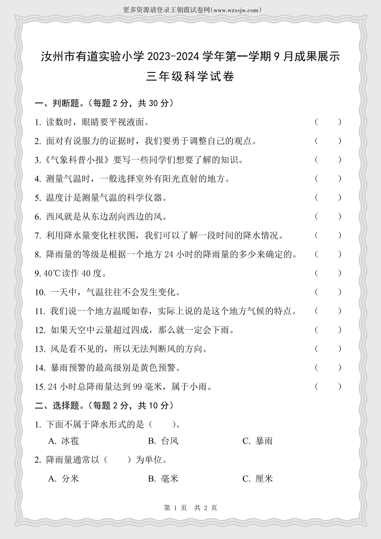 河南省平顶山市汝州市有道实验学校2023-2024学年第一学期9月成果展示试卷三年级科学(大象版)
