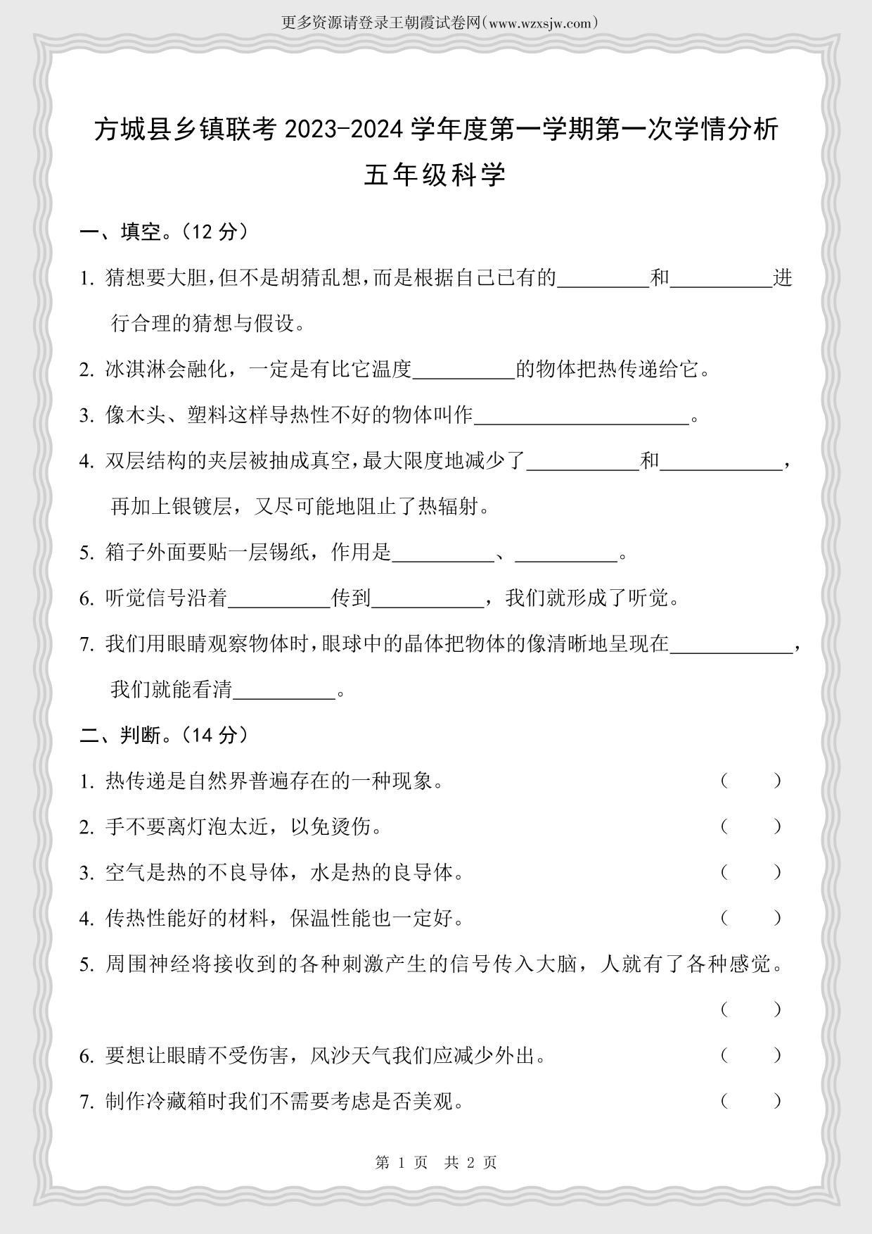 河南省南阳市方城县乡镇联考2023-2024学年度第一学期第一次学情分析10月月考五年级科学(大象版)