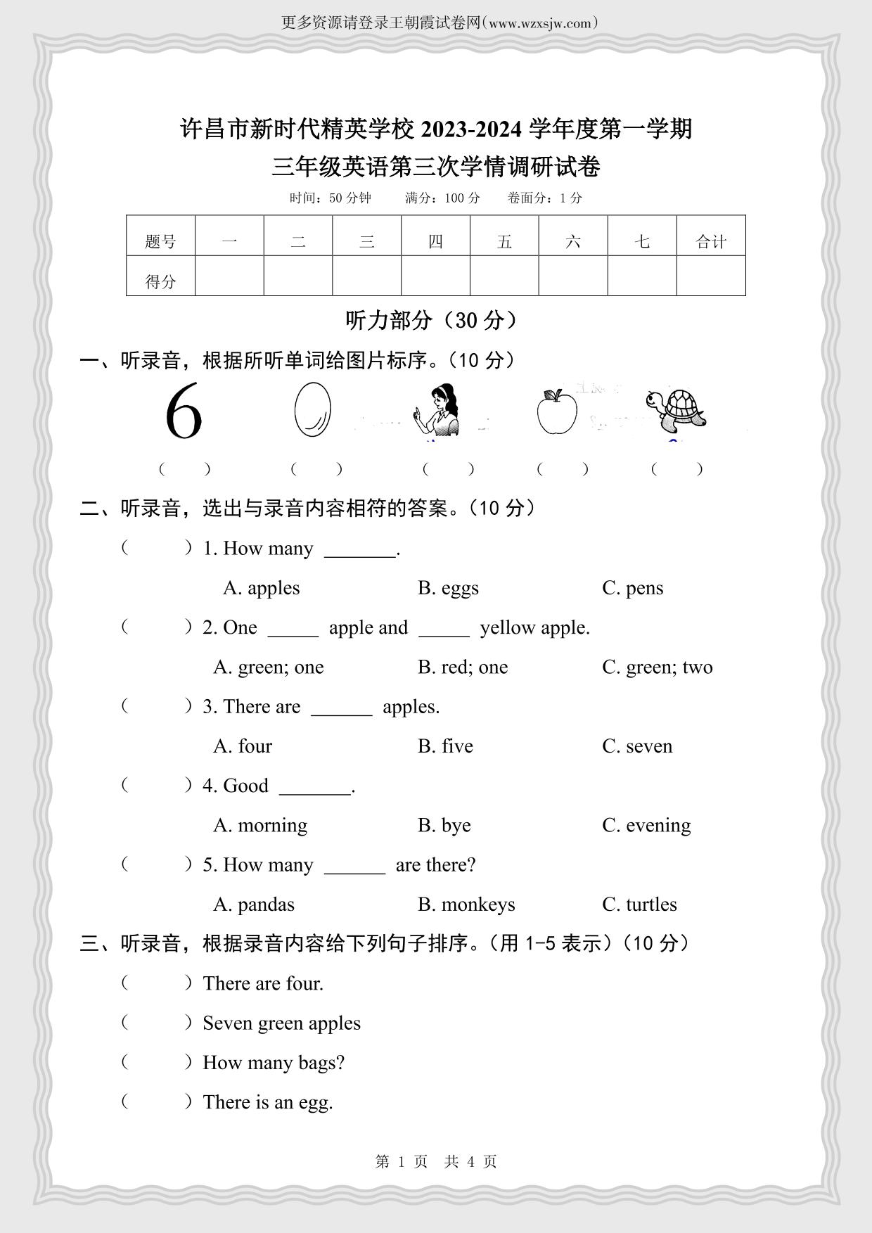 三年级英语湘鲁版上册月考卷