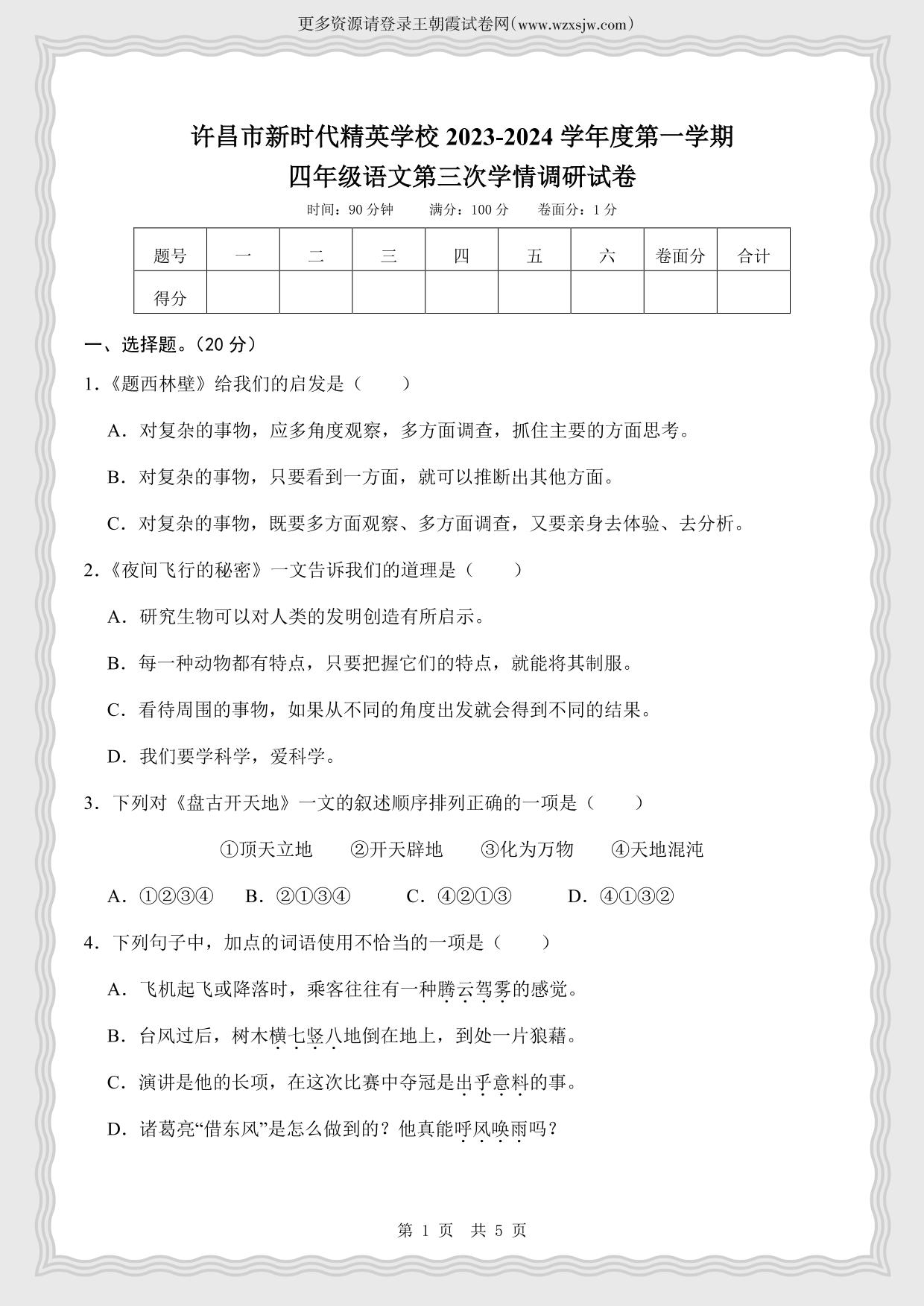 河南省许昌市东城区新时代精英学校2023-2024学年度上学期第三次学情调研月考试卷四年级语文(人教版)