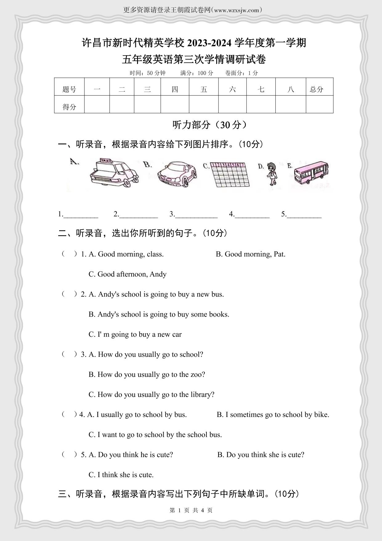 河南省许昌市东城区新时代精英学校2023-2024学年度上学期第三次学情调研月考试卷五年级英语(湘鲁版)