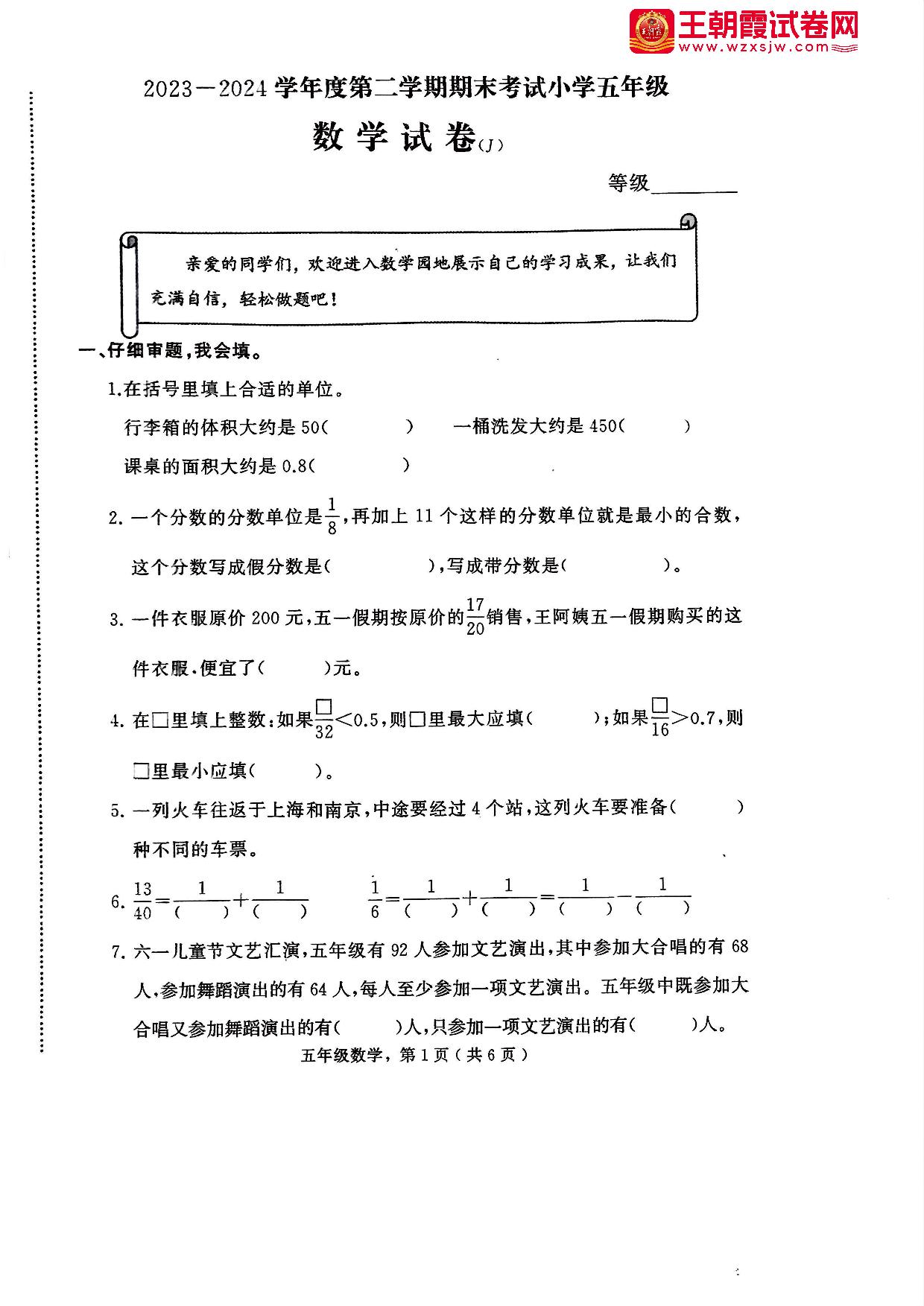 河北省石家庄市晋州市2023-2024学年度第二学期期末考试五年级数学(冀教版)