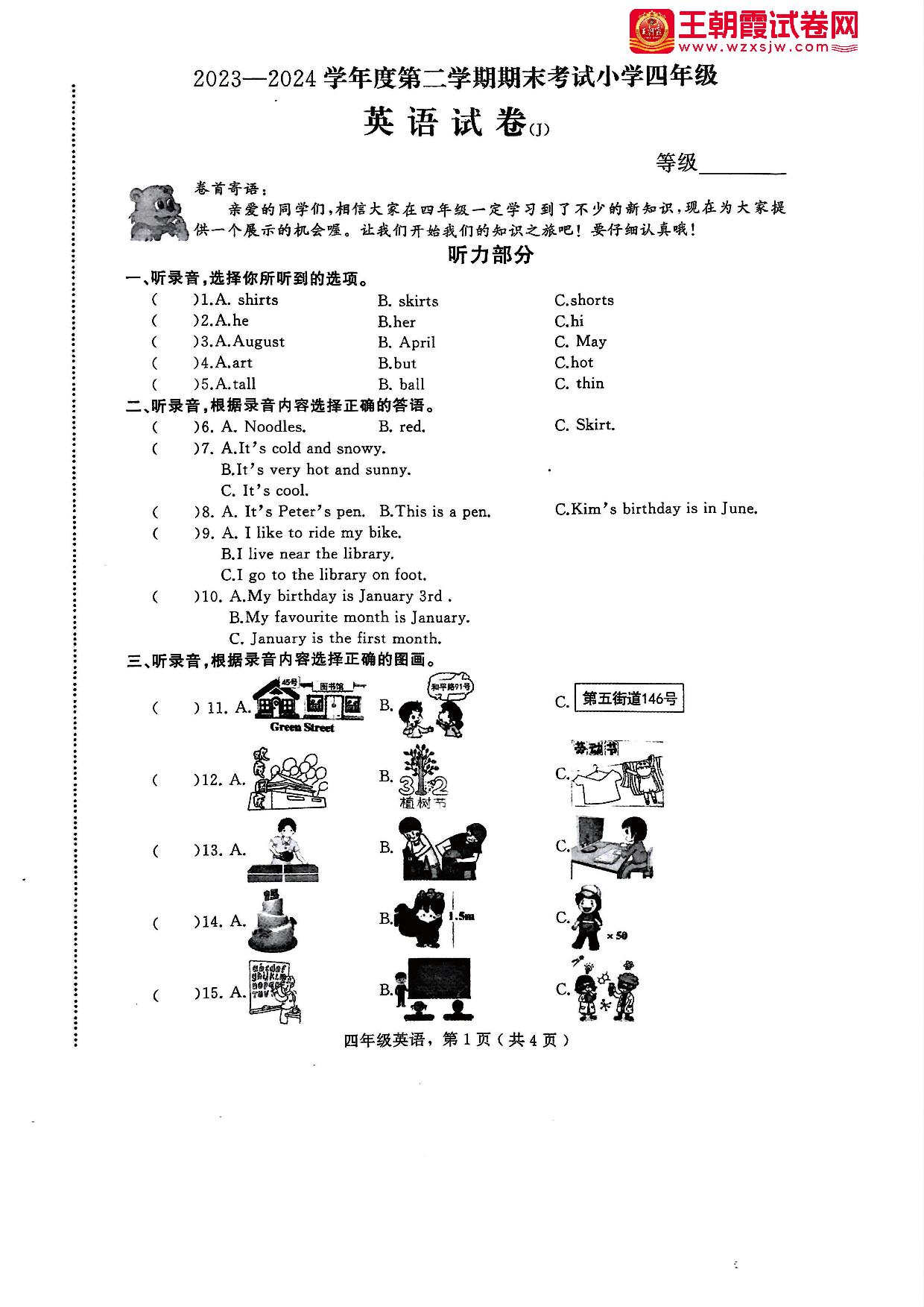 河北省石家庄市晋州市2023-2024学年度第二学期期末考试四年级英语(冀教版)