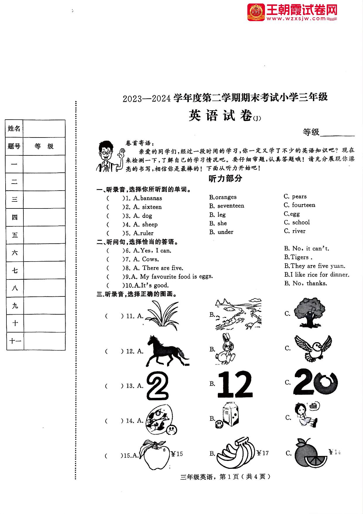 三年级英语冀教版下册期末卷