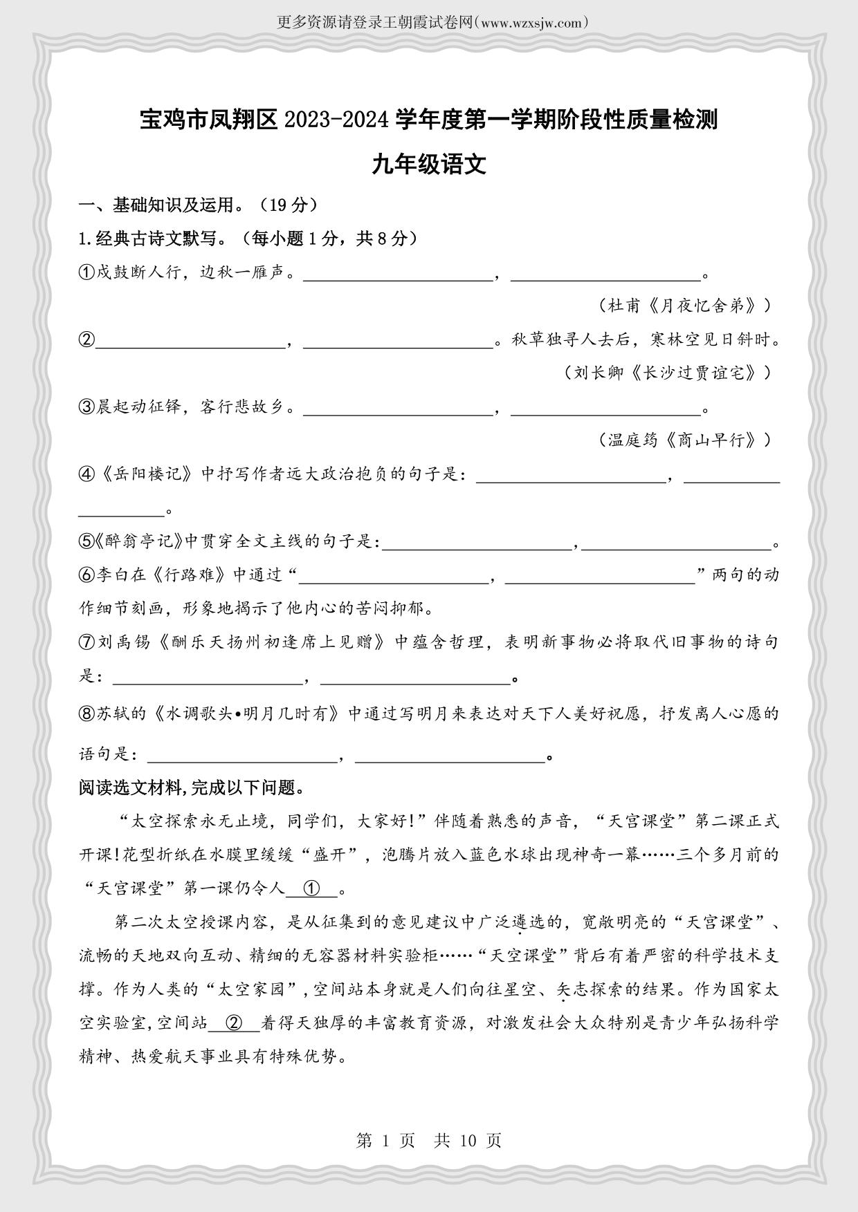 陕西省宝鸡市凤翔区2023-2024学年度第一学期阶段性质量检测九年级语文(人教版)