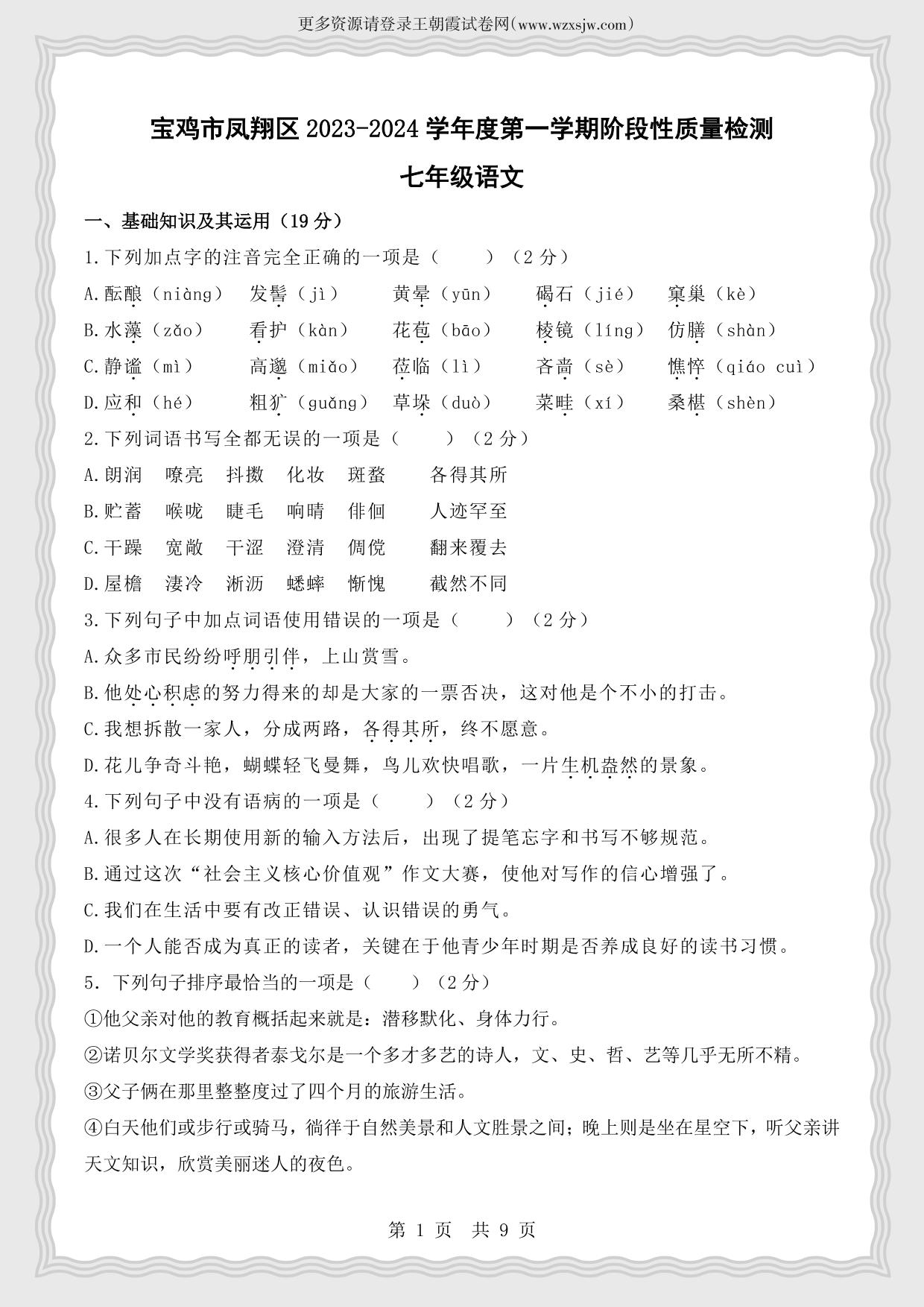 陕西省宝鸡市凤翔区2023-2024学年度第一学期阶段性质量检测七年级语文(人教版)