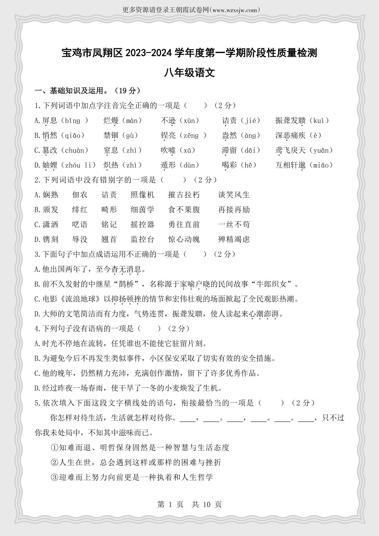 陕西省宝鸡市凤翔区2023-2024学年度第一学期阶段性质量检测八年级语文(人教版)