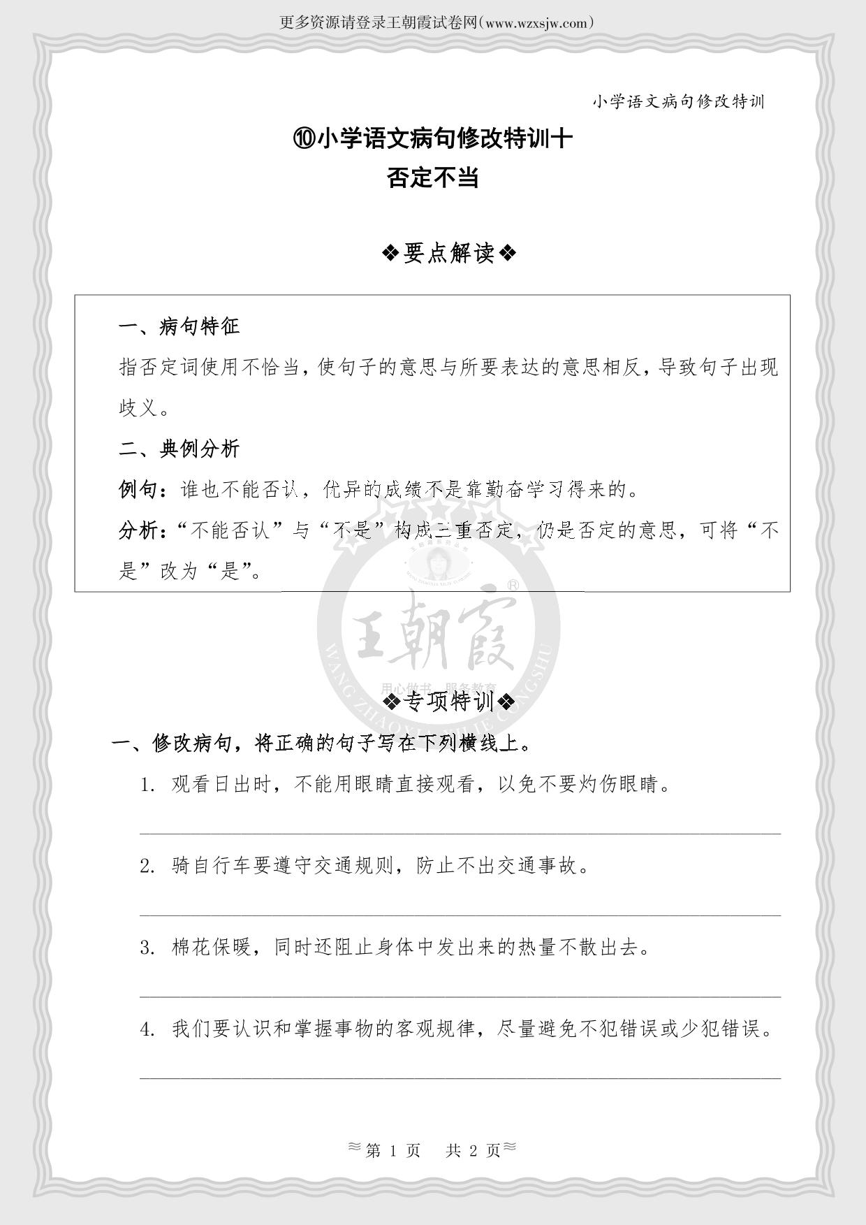 ⑩小学语文病句修改特训十·否定不当