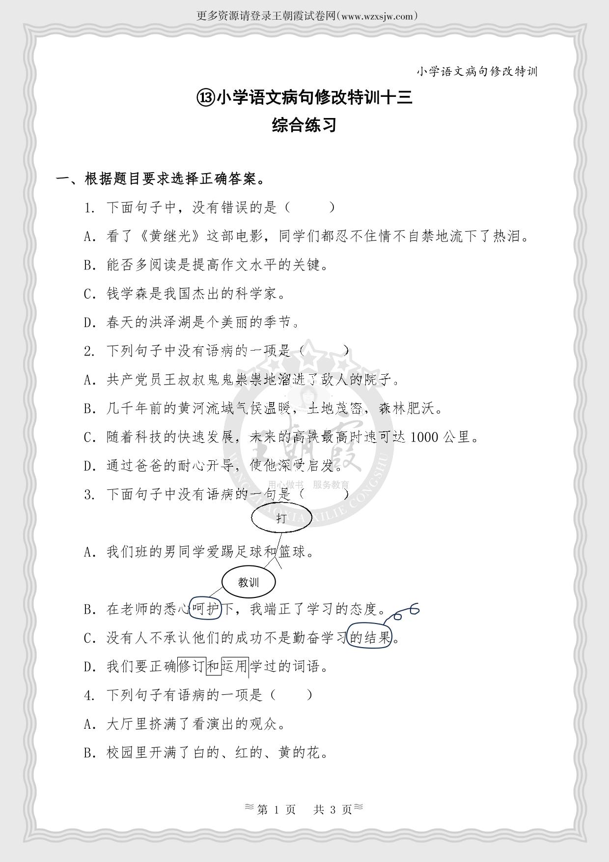 ⑬小学语文病句修改特训十三·综合练习