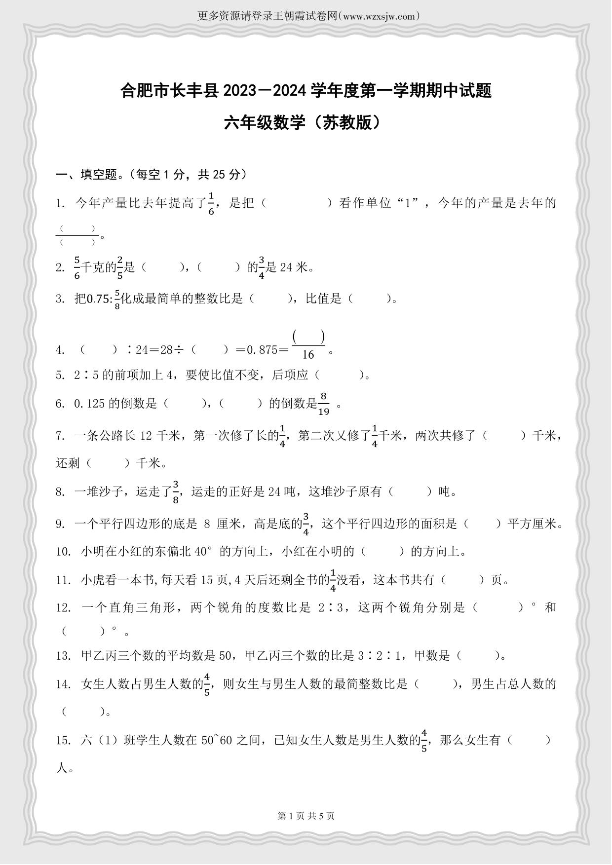 安徽省合肥市长丰县2023-2024学年度第一学期期中考试试题六年级数学(苏教版)