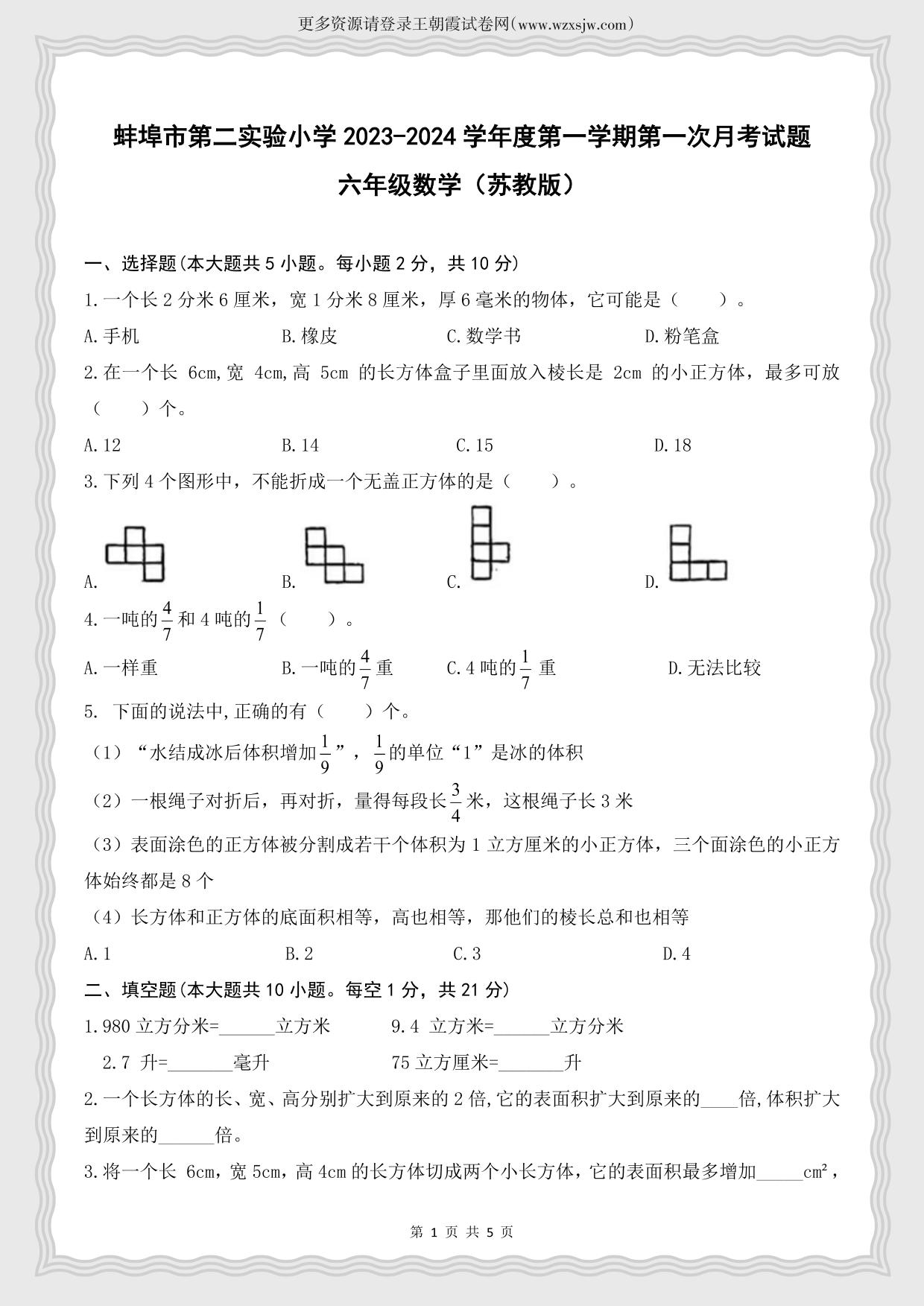 安徽省蚌埠市蚌埠第二实验小学2023-2024学年度第一学期(月考)试题六年级数学(苏教版)