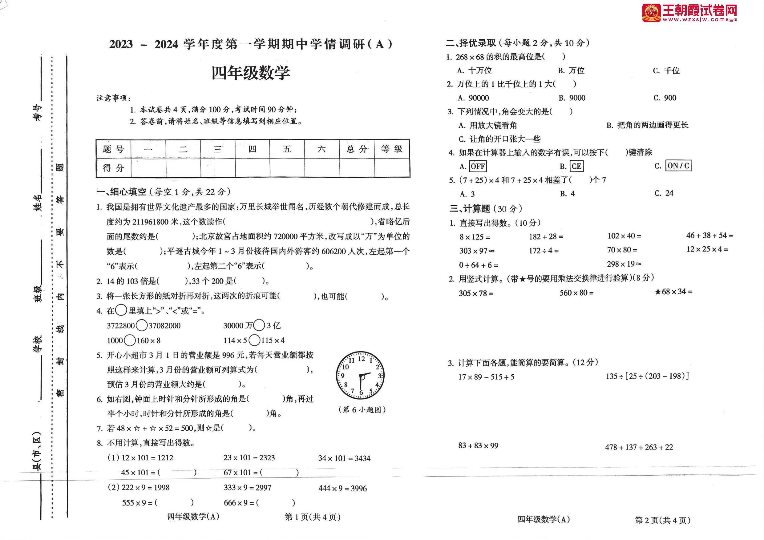 安徽省阜阳市临泉县2023-2024学年度第一学期期中学期调研四年级数学(北师版)