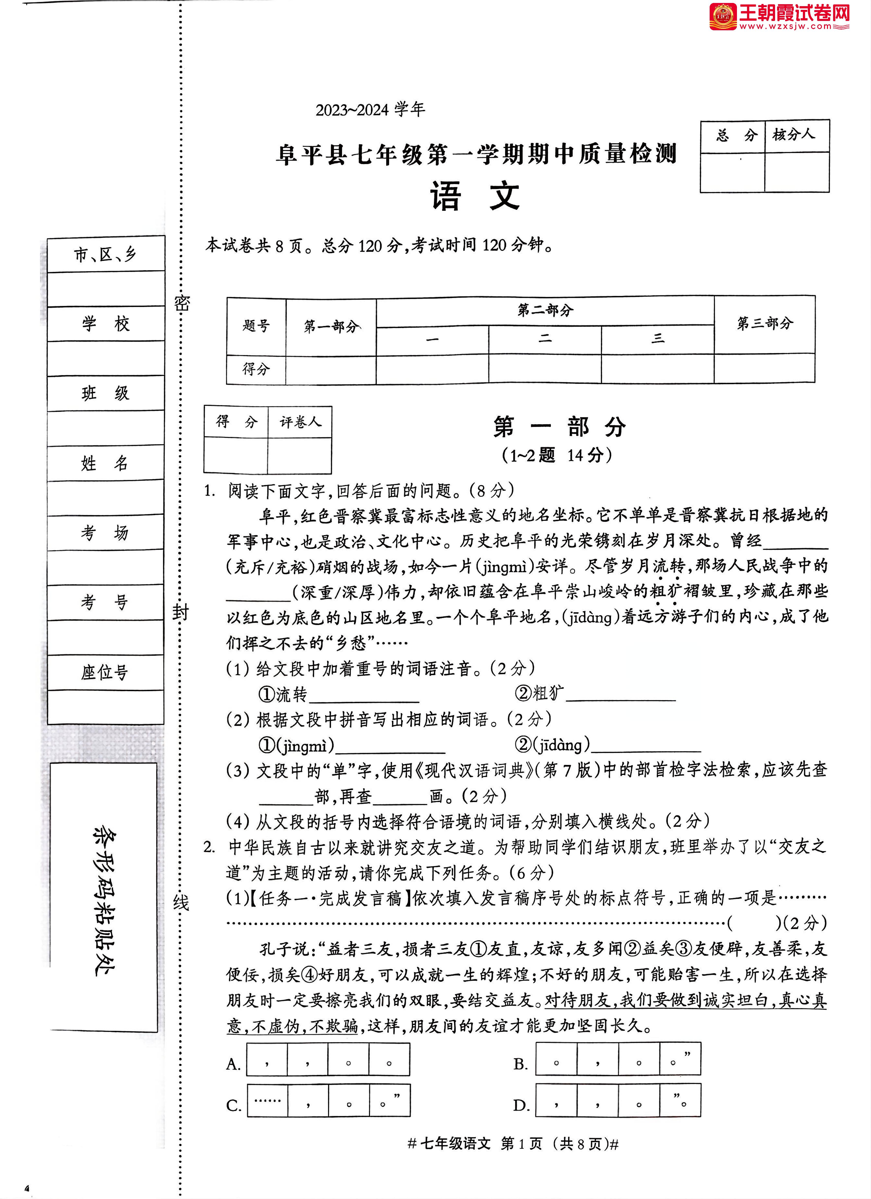 七年级语文人教版上册期中卷