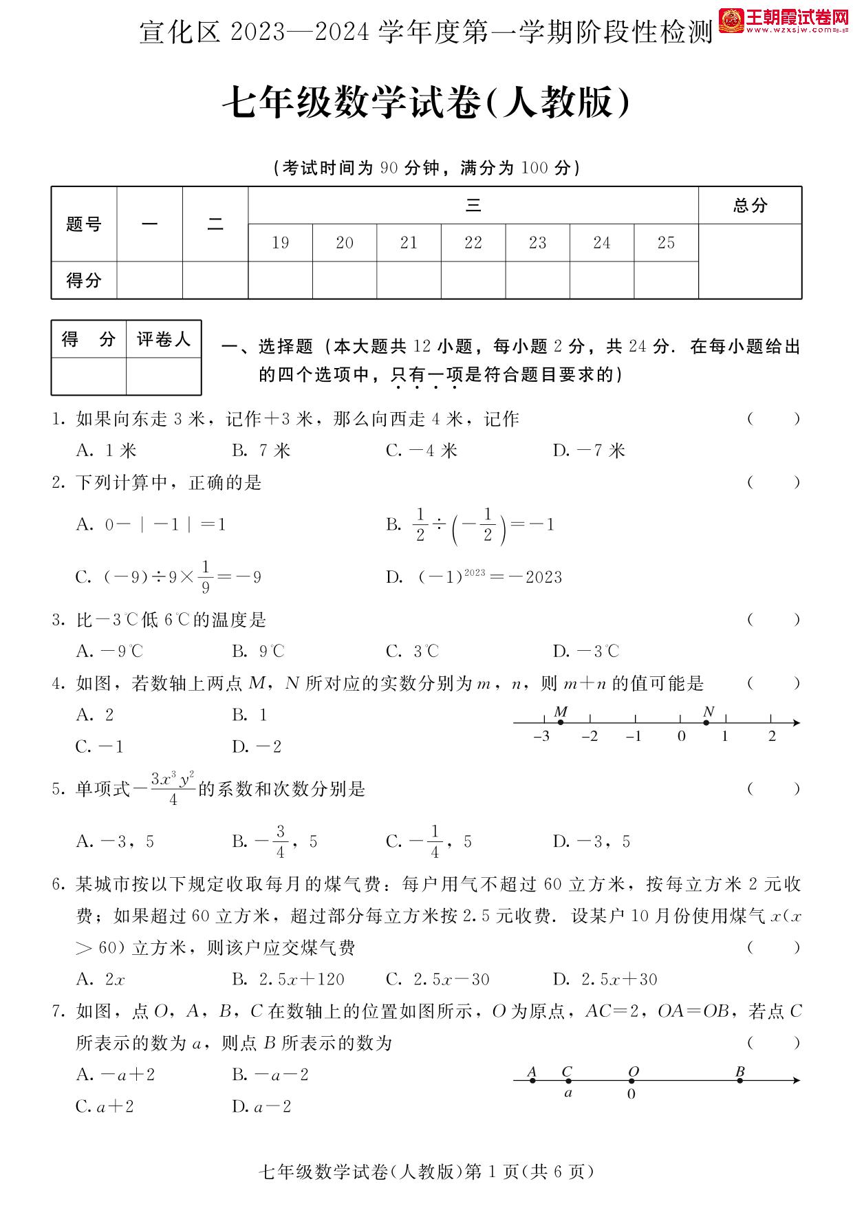 河北省张家口市宣化区2023-2024学年度第一学期期中阶段性检测七年级数学(人教版)