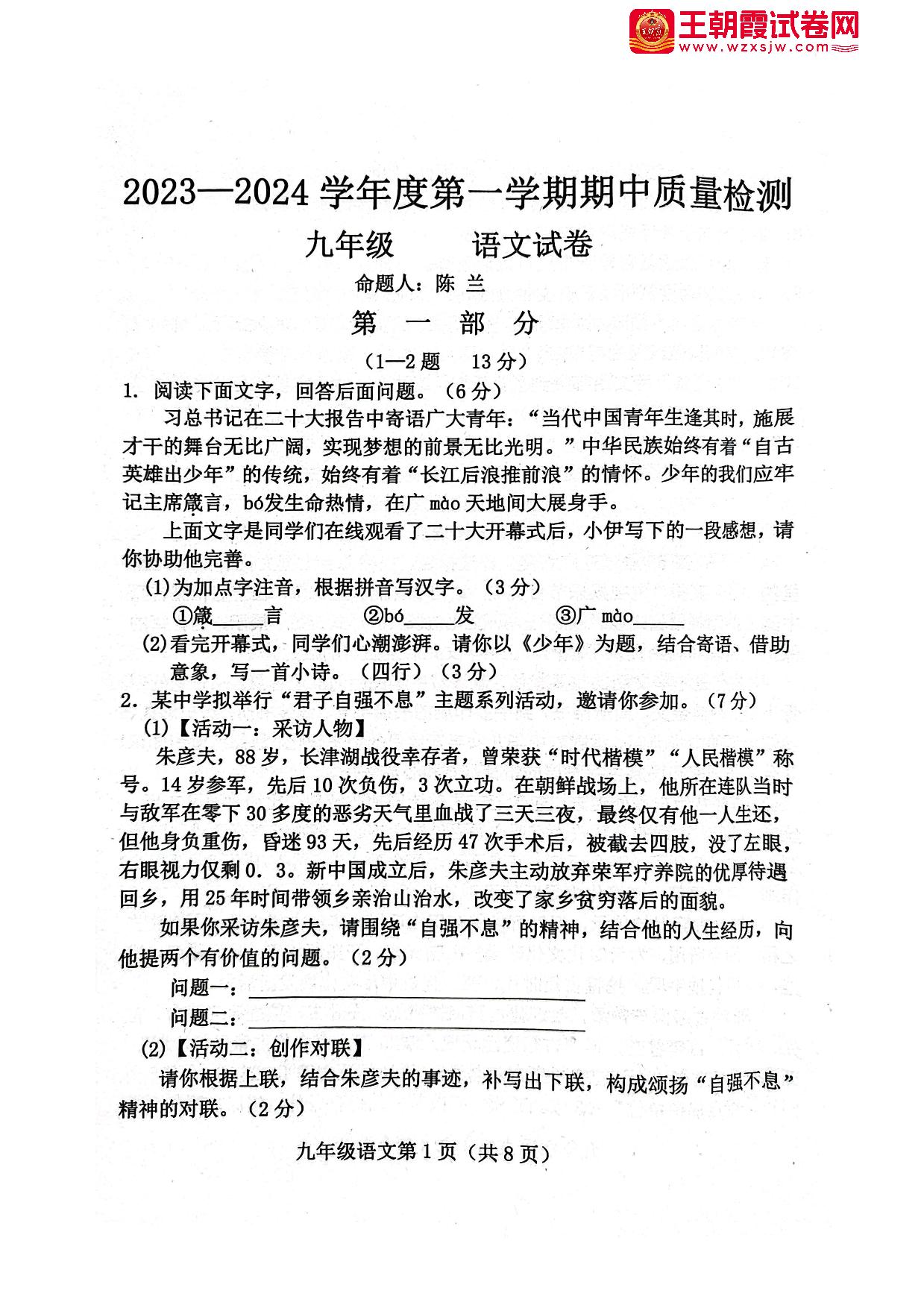 河北省保定市曲阳县2023-2024学年度第一学期期中质量检测九年级语文(人教版)