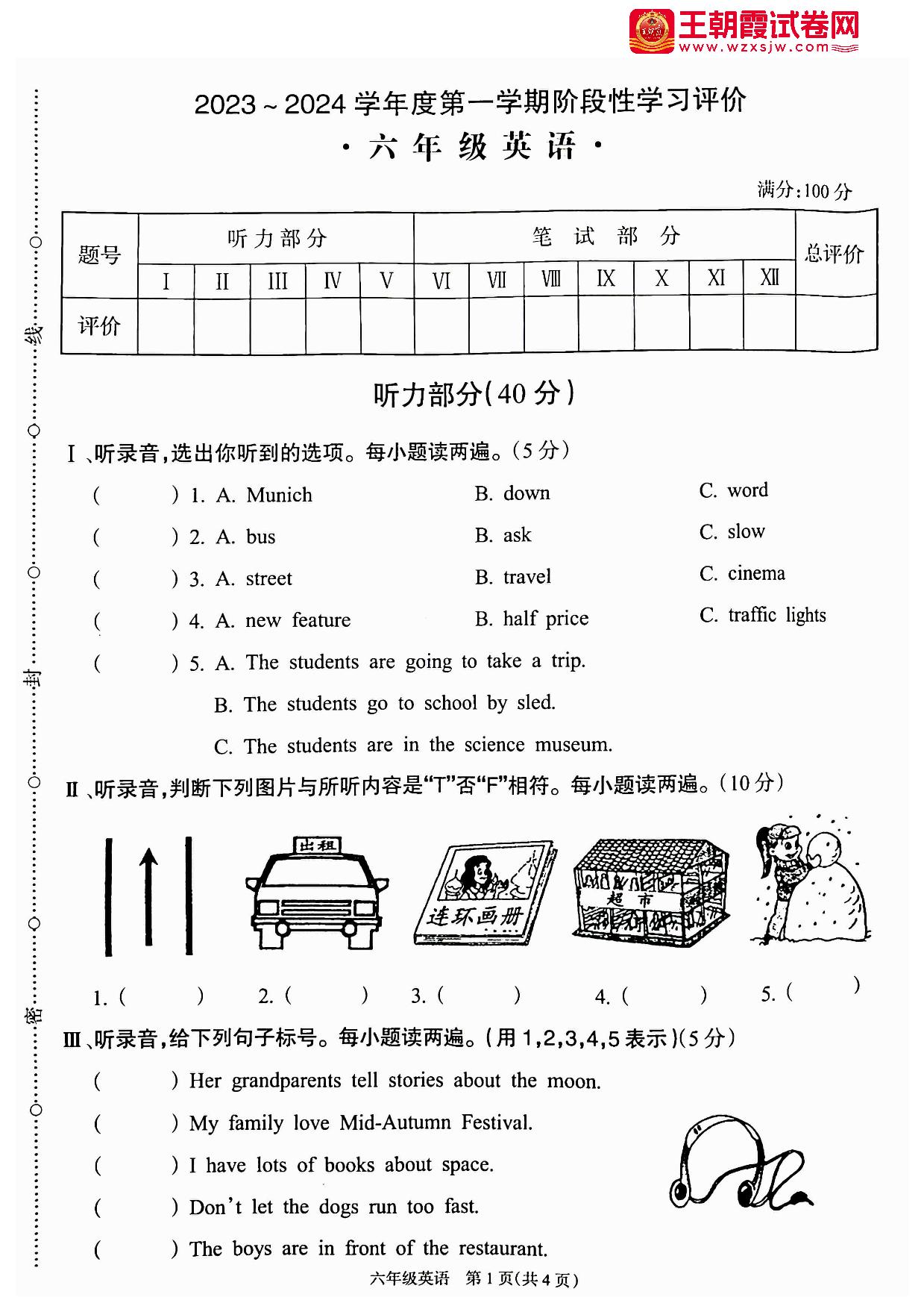 安徽省芜湖市无为市2023-2024学年度第一学期(期中)阶段性学习评价六年级英语(人教PEP版)【无听力音频】