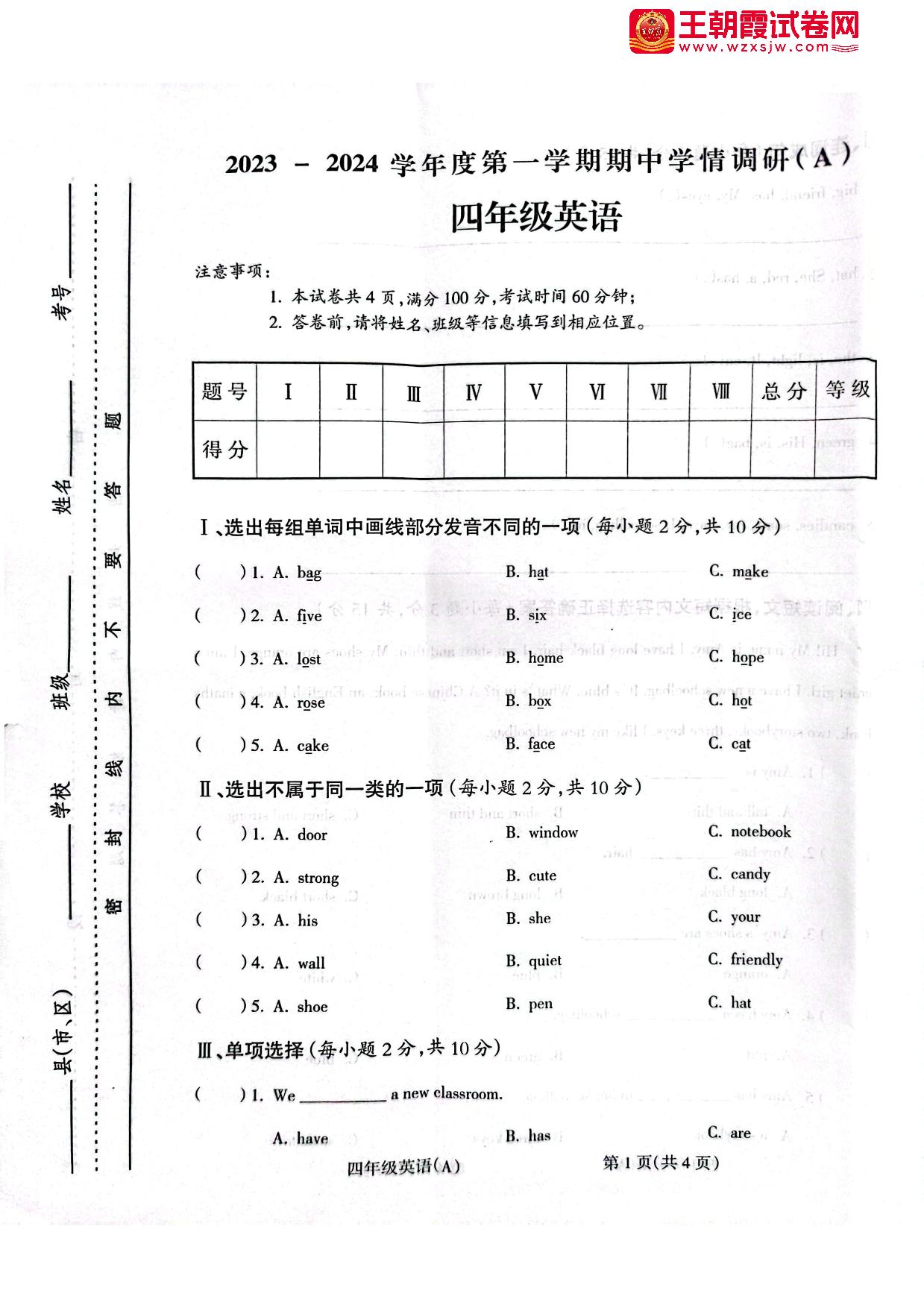 安徽省亳州学院附属学校2023-2024学年度第一学期期中学期调研四年级英语(人教PEP版)