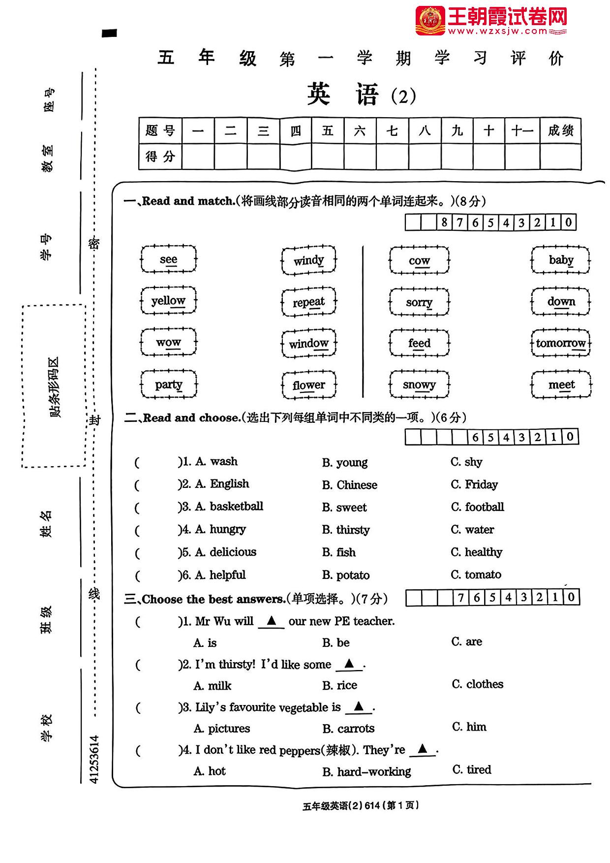 五年级英语人教PEP版(三起始)上册期中卷