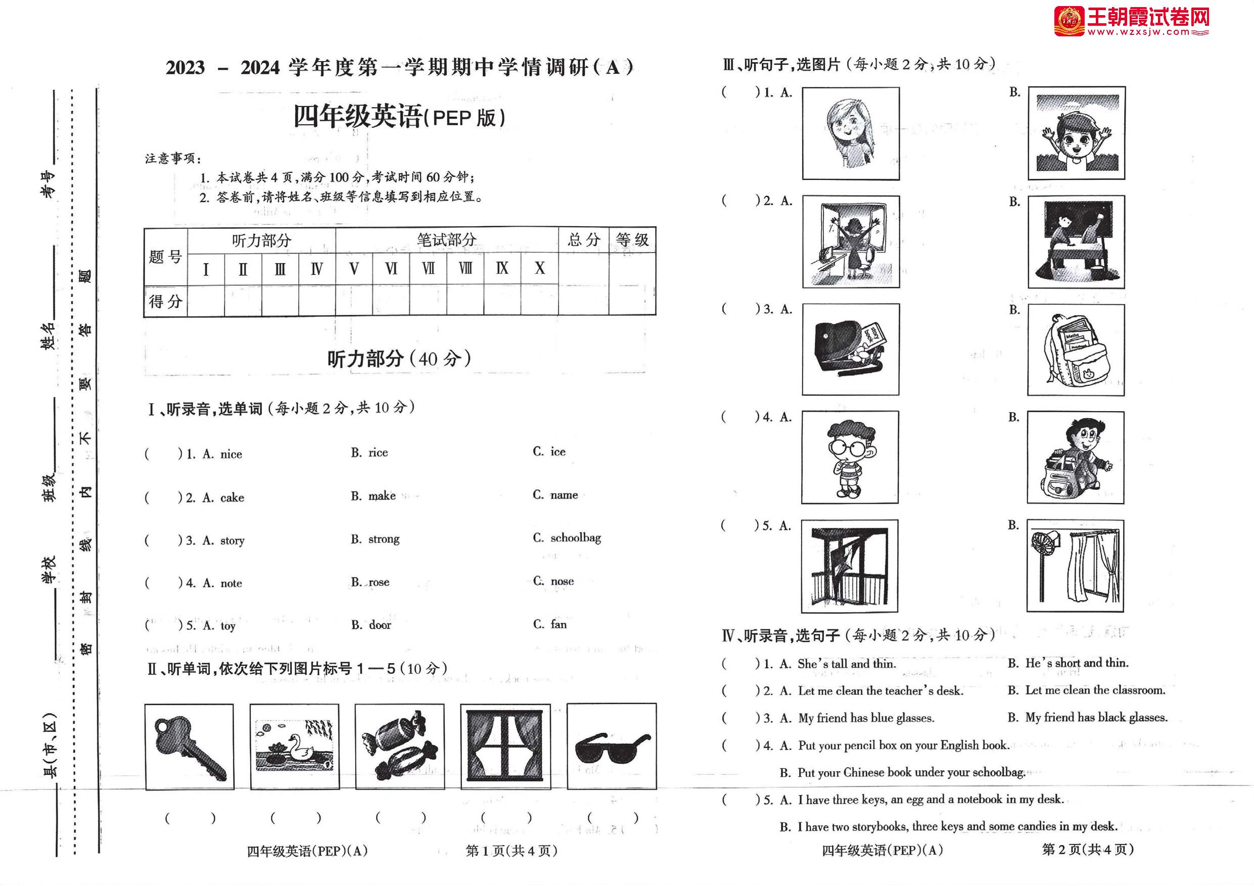 四年级英语人教PEP版(三起始)上册期中卷