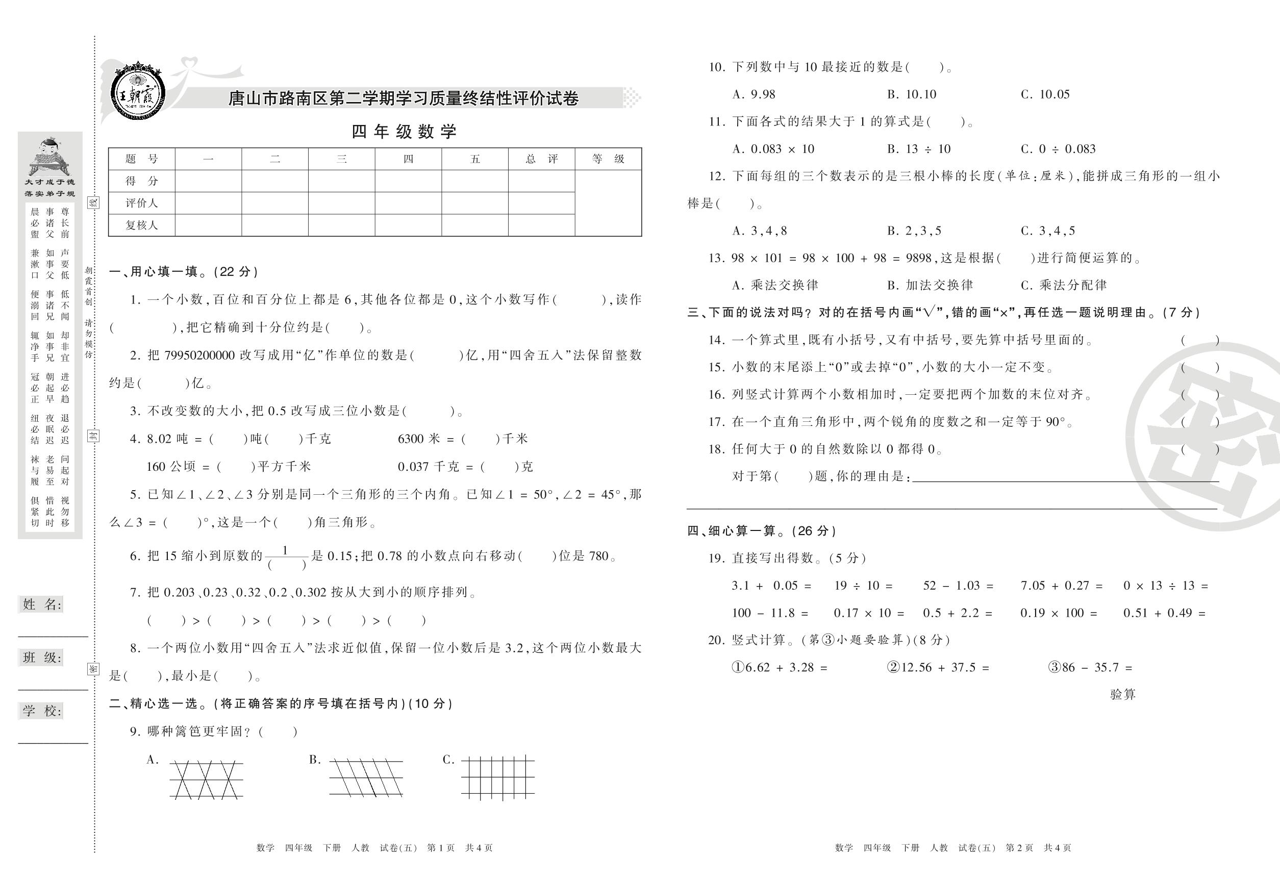 2015-2016学年第二学期唐山市路南区四年级数学试卷(人教版)【5】
