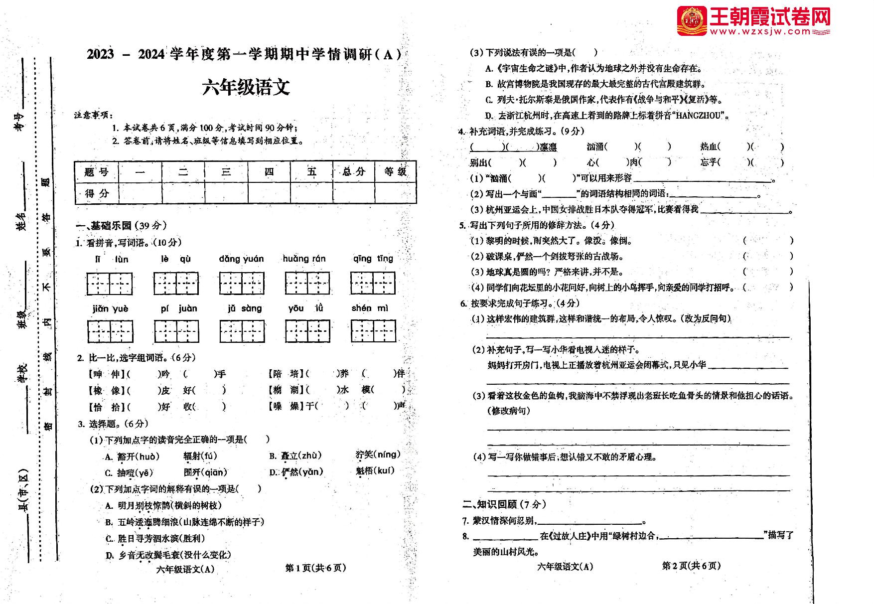 安徽省六安市霍邱县2023-2024学年度第一学期期中学情调研六年级语文(人教版)