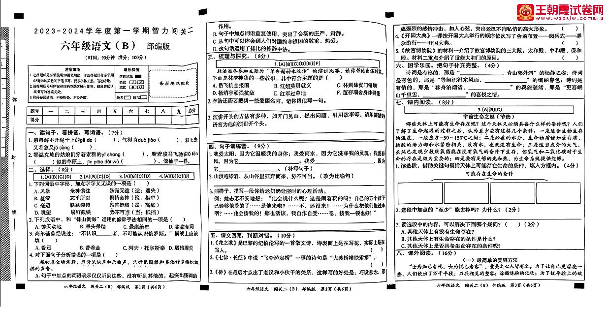 安徽省合肥市2023-2024学年度第一学期(期中)智力闯关六年级语文(人教版)