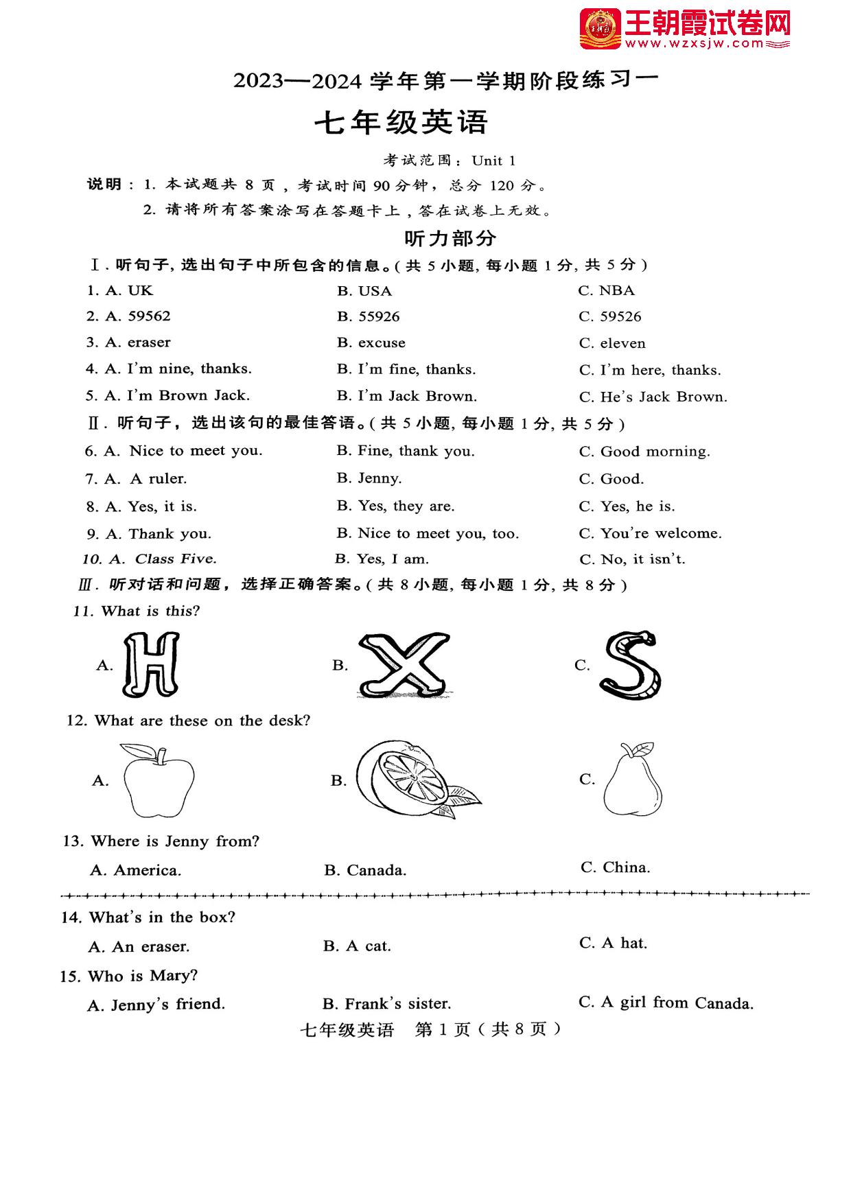 七年级英语新课标版上册期中卷