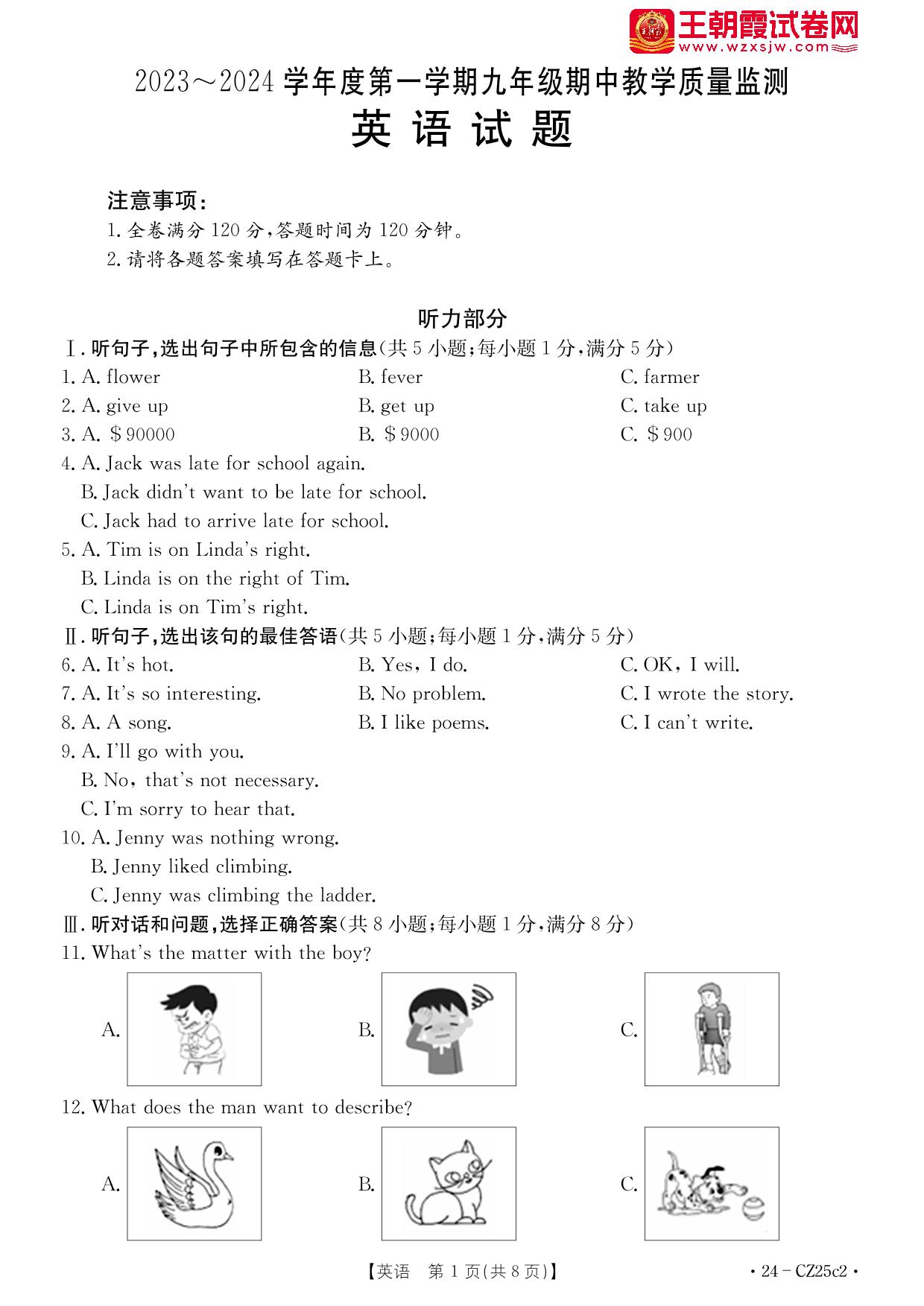 河北省保定市安新县2023-2024学年度第一学期期中质量监测九年级英语(冀教版)【无听力音频】