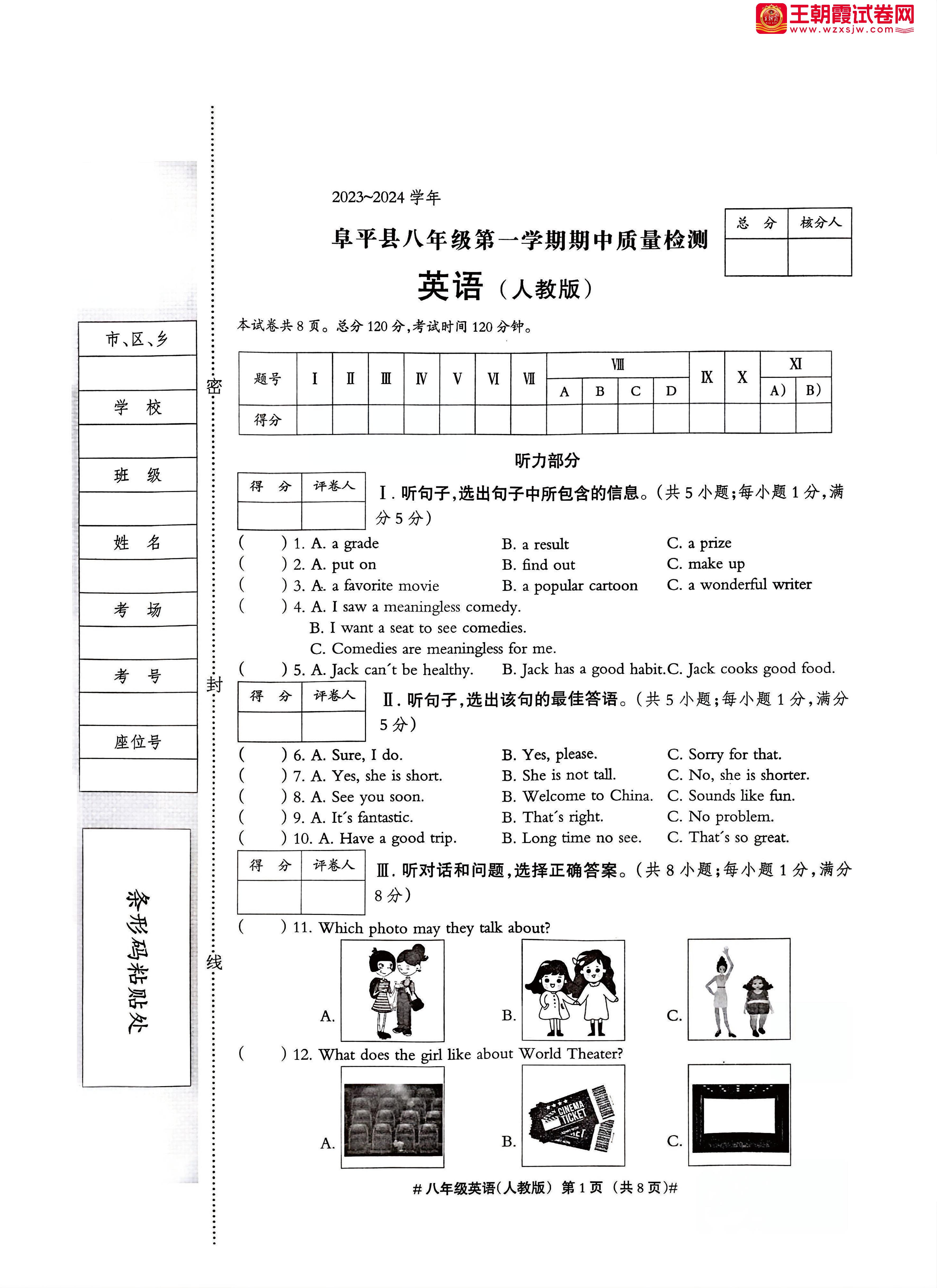 河北省保定市阜平县2023-2024学年第一学期期中质量检测八年级英语(人教版)