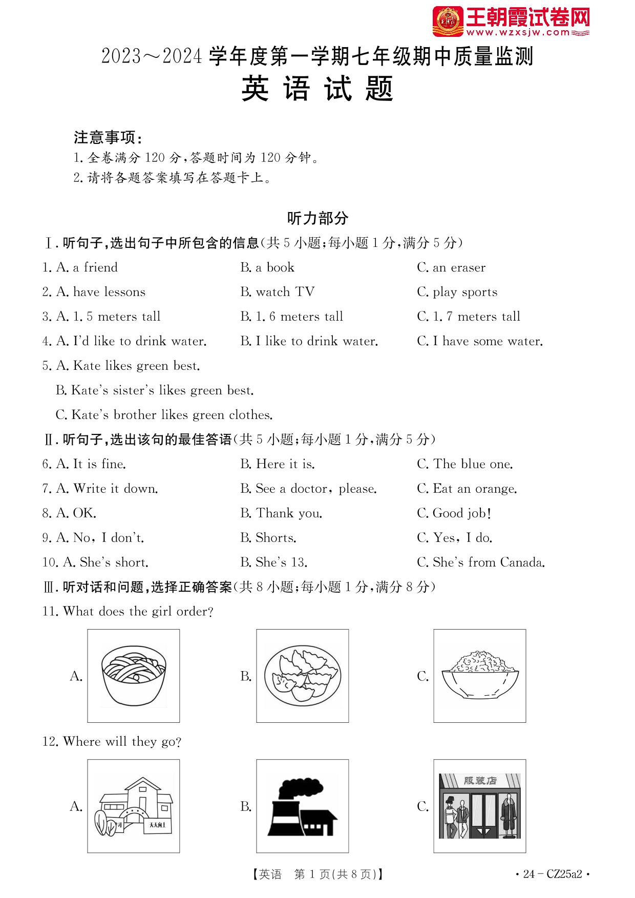 七年级英语冀教版上册期中卷