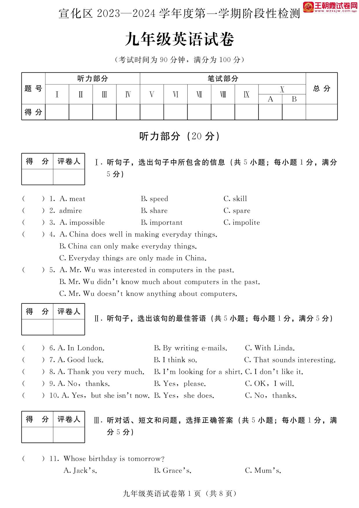 河北省张家口市宣化区2023-2024学年度第一学期期中阶段性检测九年级英语(人教版)【无听力音频】