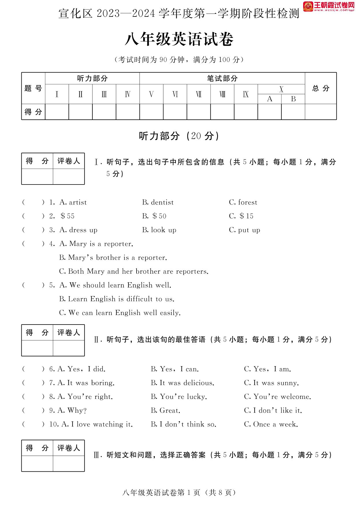 河北省张家口市宣化区2023-2024学年度第一学期期中阶段性检测八年级英语(人教版)【无听力音频】