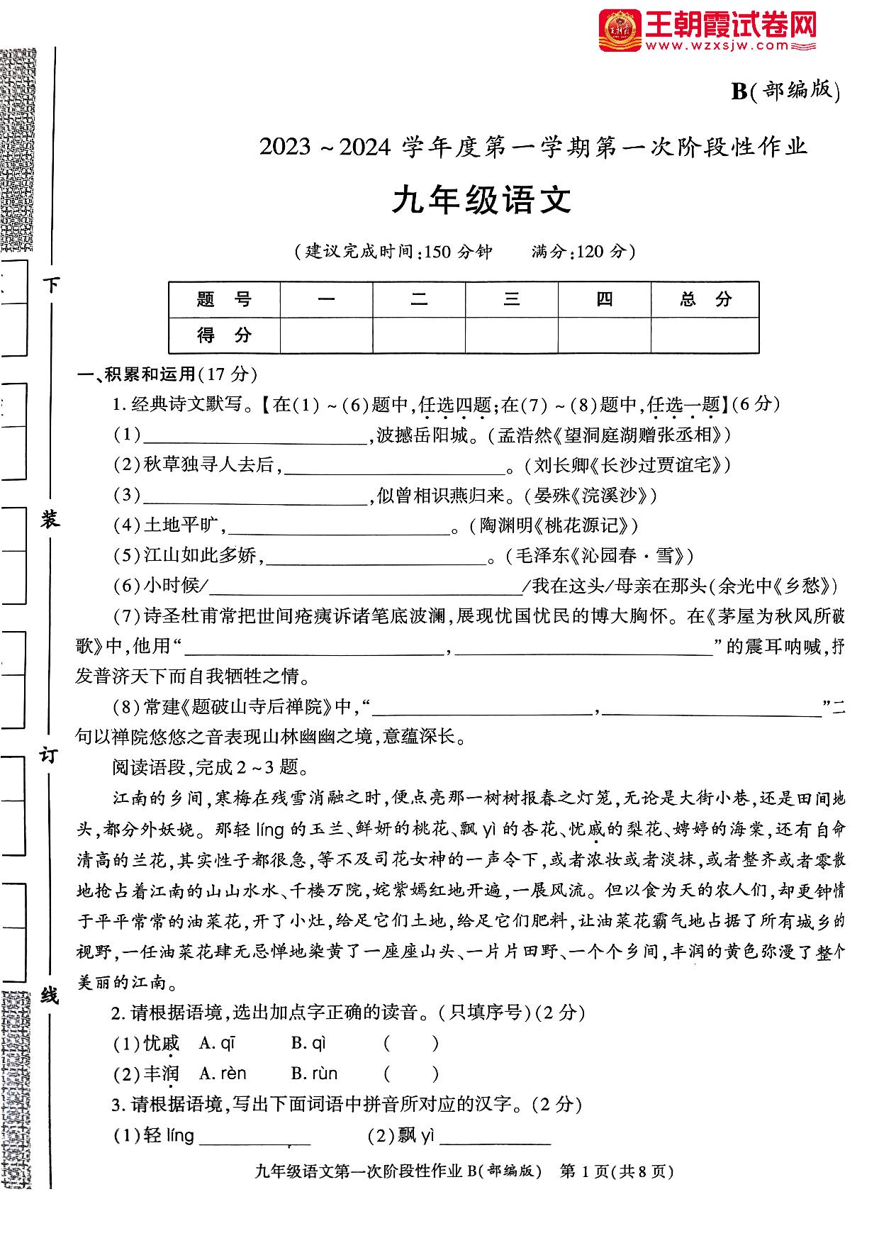 陕西省咸阳方圆学校2023-2024学年度第一学期第一次阶段性作业(月考)九年级语文(人教版)