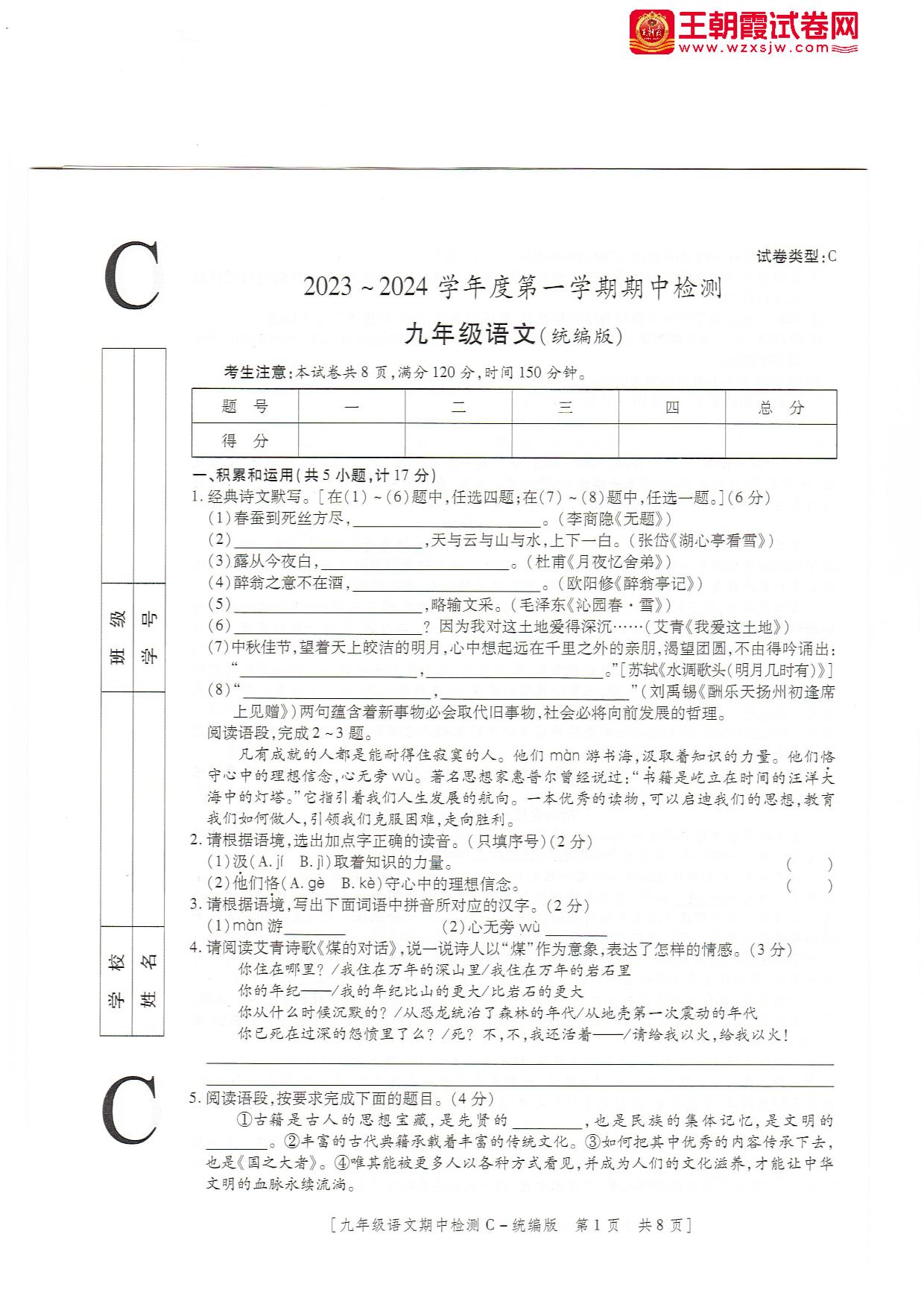 陕西省榆林市定边县第七中学2023-2024学年度第一学期期中检测九年级语文(人教版)