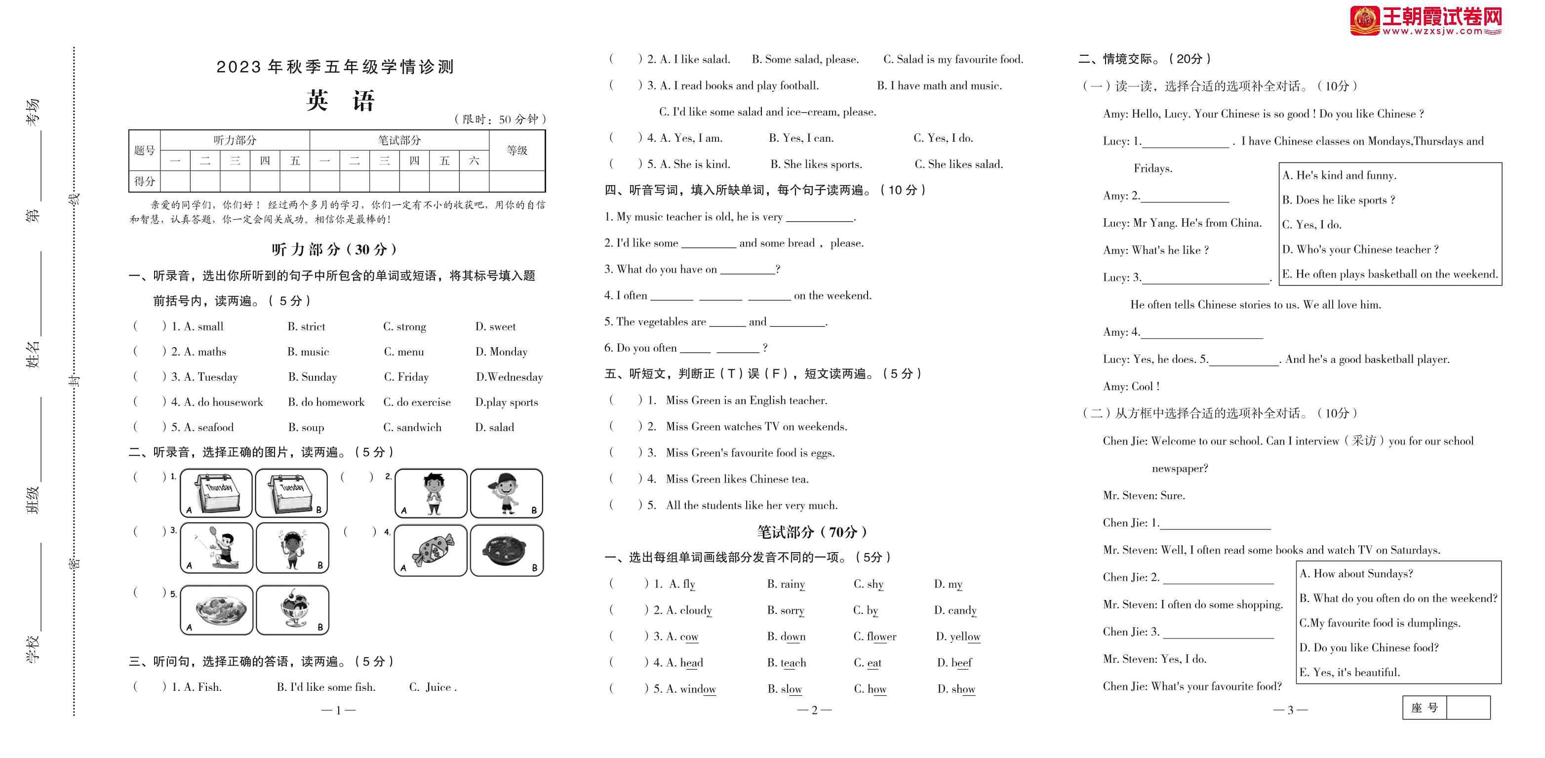 河南省三门峡市湖滨区2023-2024学年上学期期中学情诊测试题五年级英语(人教PEP版)【无听力音频】