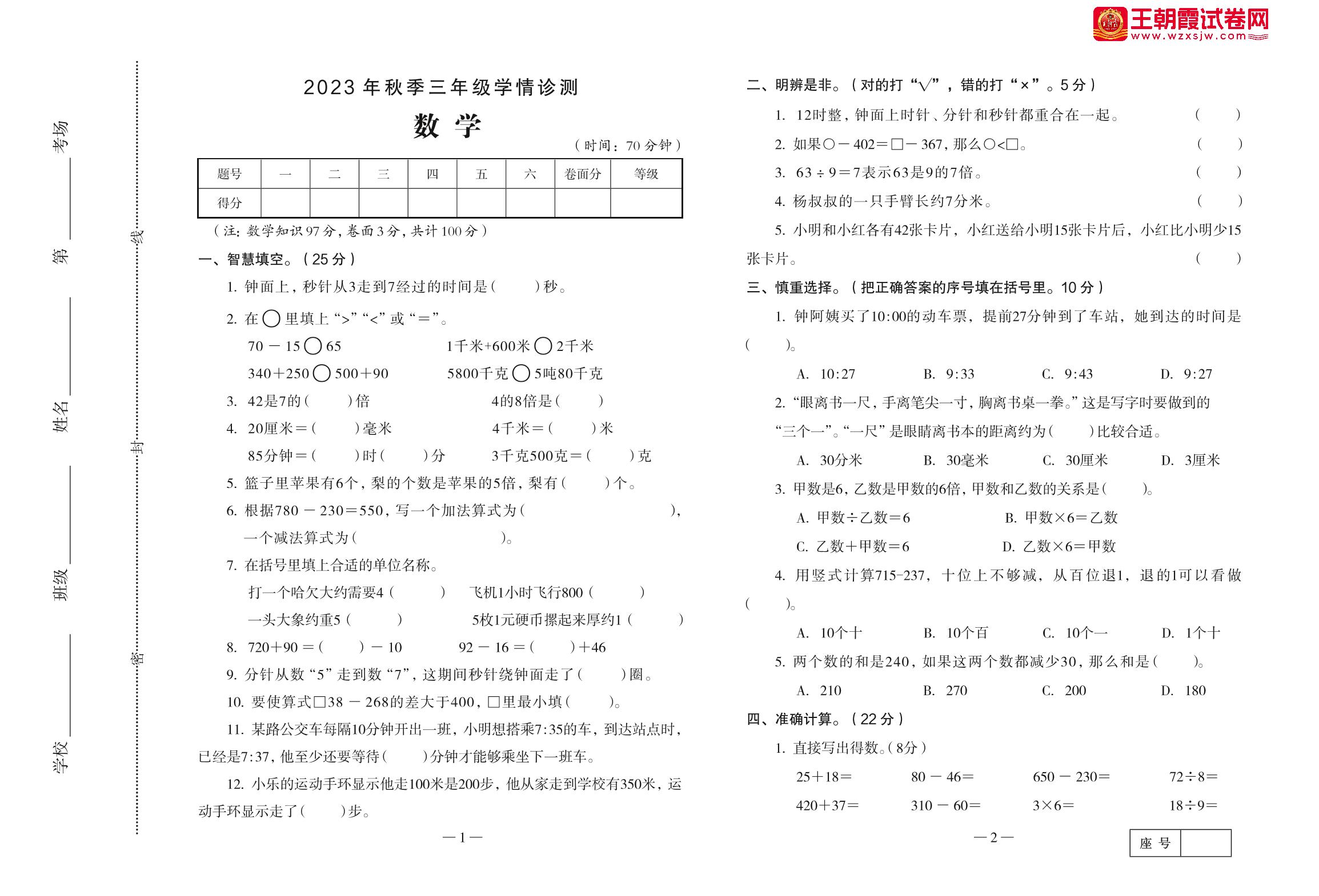 河南省三门峡市湖滨区2023-2024学年上学期期中学情诊测试题三年级数学(人教版)